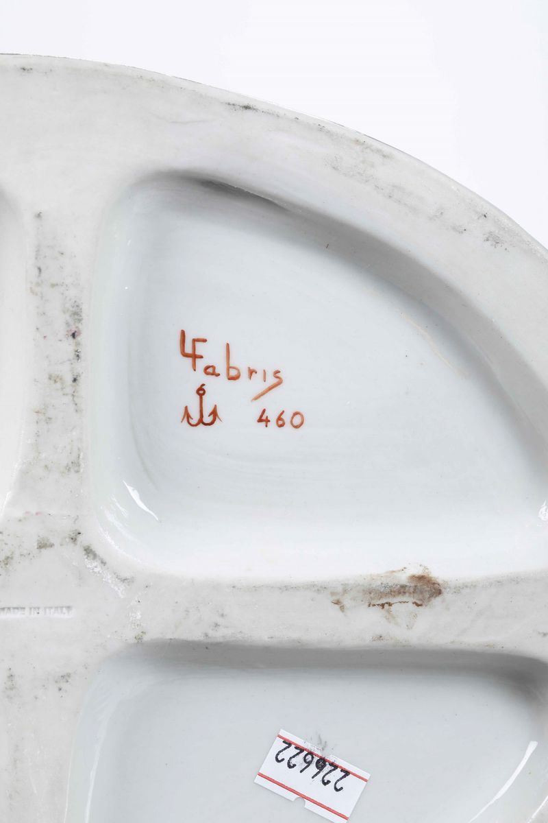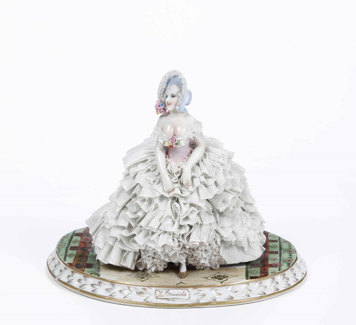 Porcellana. Marca: L Fabris” con ancora e numero 460 in rosso ferro; made in italy impresso. Dimensioni: altezza cm 22,7; cm 26,9x21. Conservazione: il tulle della gonna in parte rovinato, in alcuni pieghe assente; insignificante mancanza all'oro della base