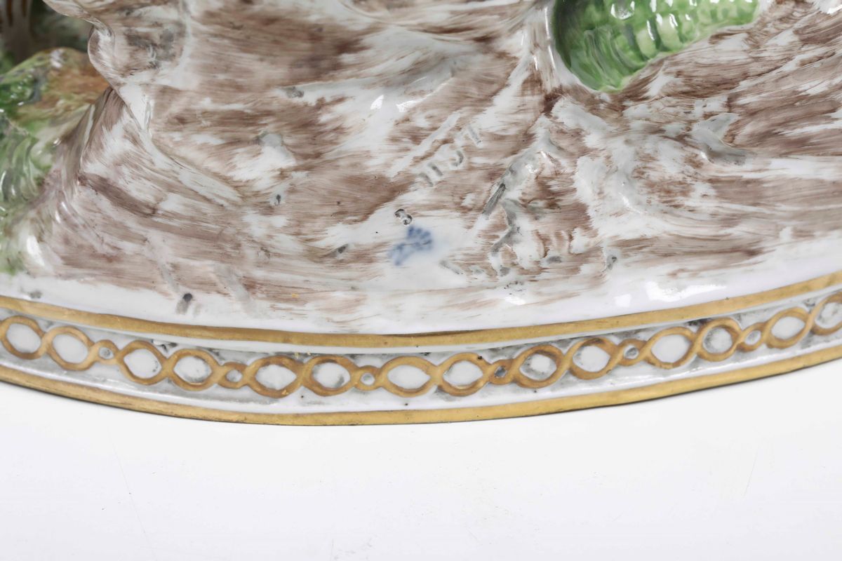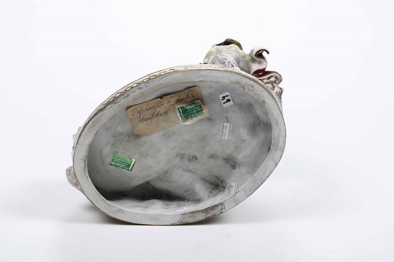 Porcellana. Marca: ”N” con corona in blu sul retro; etichetta F.lli Squarcina antichità Genova” alla base. Dimensioni: altezza cm 27,3; cm 24,9x20,6. Conservazione: mancanze agli oggetti musicali e a qualche dita