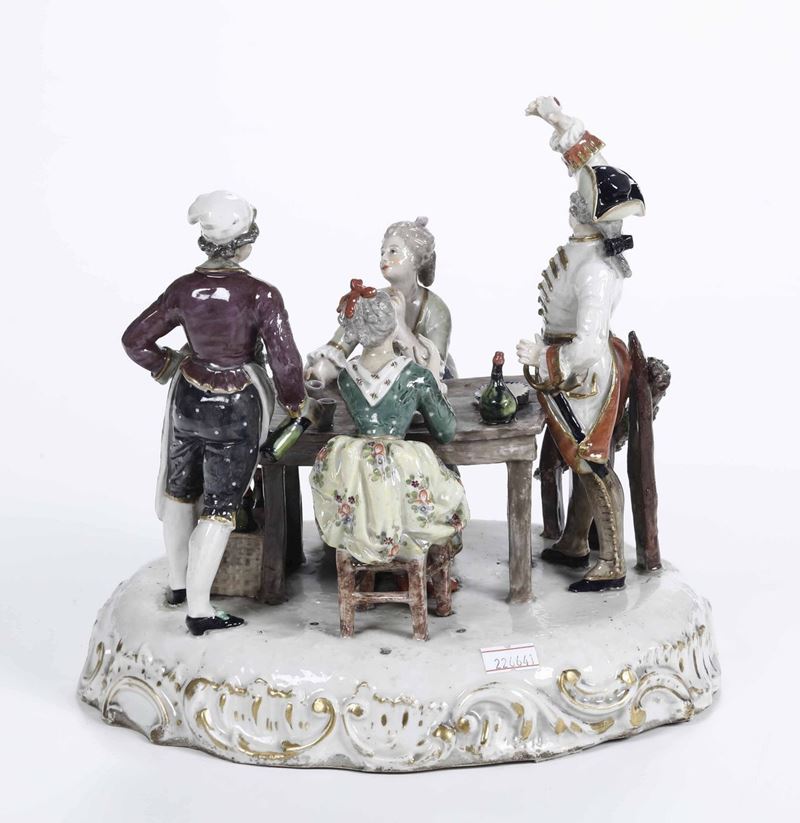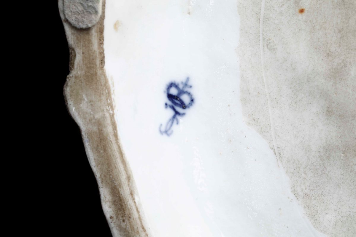 Porcellana. Marca: apocrifa di Frankenthal con “CT” e corona, in blu. Dimensioni: altezza cm 23,1; cm 26,5x20,8. Conservazione: estesi restauri alla base; usure all’oro