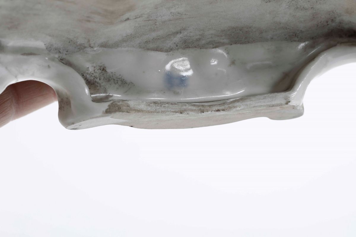 Porcellana. Marca: illeggibile, in blu. Dimensioni: altezza cm 19,4; cm 24,9x14,8. Conservazione: insignificanti usure all’oro