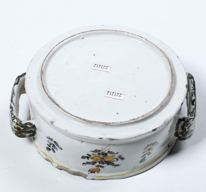 Maiolica. Altezza cm 7,9; diametro massimo cm 22,2. Conservazione: sbeccature al bordo superiore; felature