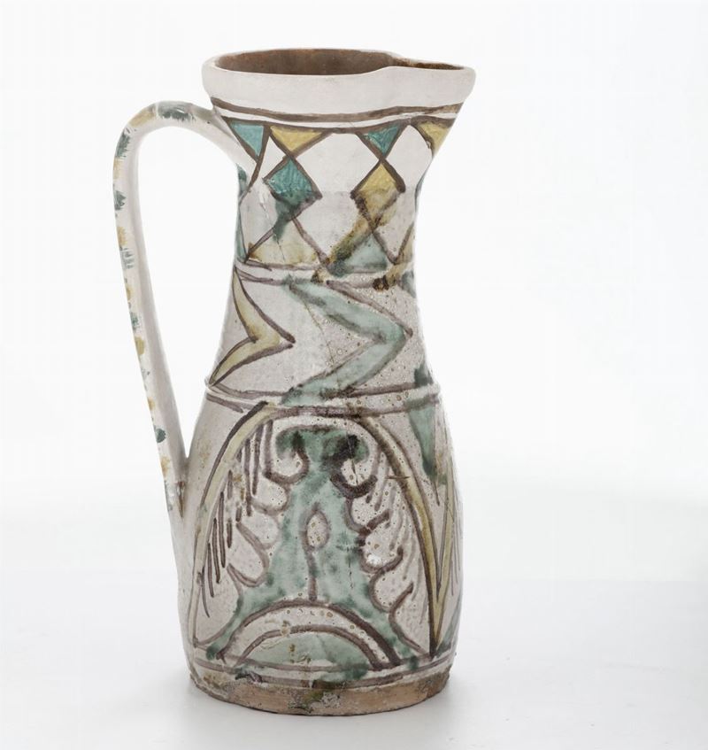 Maiolica. Altezza cm 26. Conservazione: beccuccio, orlo superiore e manico rifatti; felatura; cadute di smalto alla base