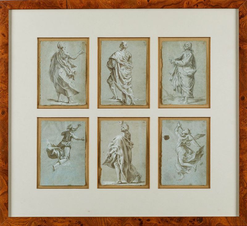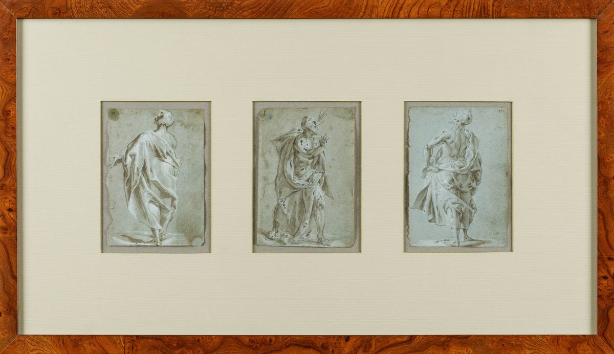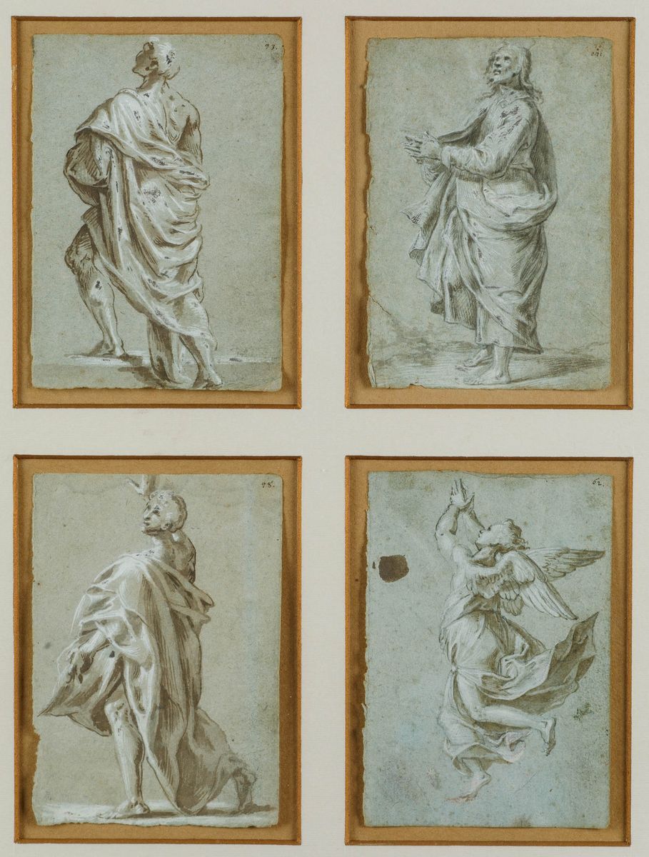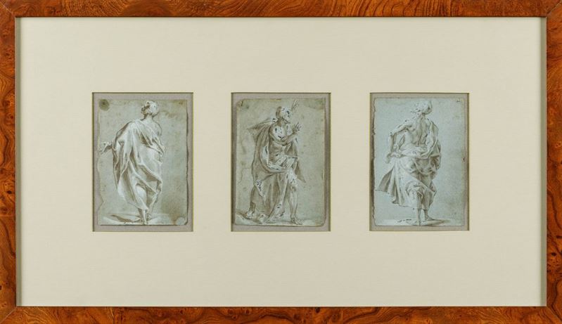 tre disegni a penna, biacca, inchiostro bruno acquerellato su carta preparata azzurra, mm 135x93 ca.