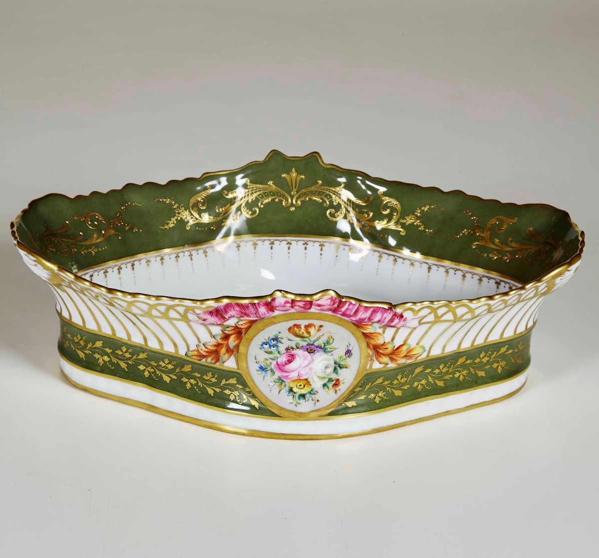 Questa bacinella è una interpretazione moderna di porcellane francesi settecentesche. Sul fondo, al centro, è dipinta con un fine bouquet policromo incorniciato in oro. Il resto della superficie presenta motivi vegetali rocaille in oro su fondo verde