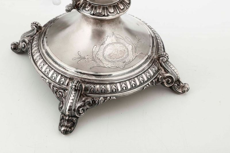 Sostegno a balaustro con piede circolare e decori con sfingi alate e volute. Coppa in cristallo sagomato e molato e anse a girali floreali