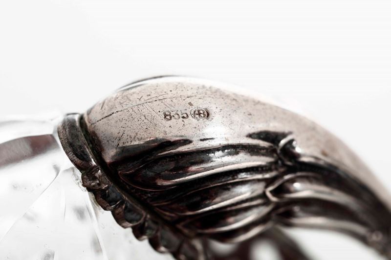 Coppia di saliere a foggia di cigno in argento fuso e cesellato e cristallo molato. Argenteria artistica italiana del XX [..]