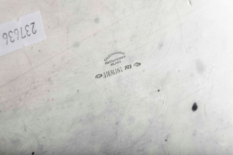 Grande guantiera in argento sterling. Argenteria artistica milanese del XX secolo. Bollo con fascio littorio in uso dal 1935 al 1945 e bollo dell'argentiere Calderoni