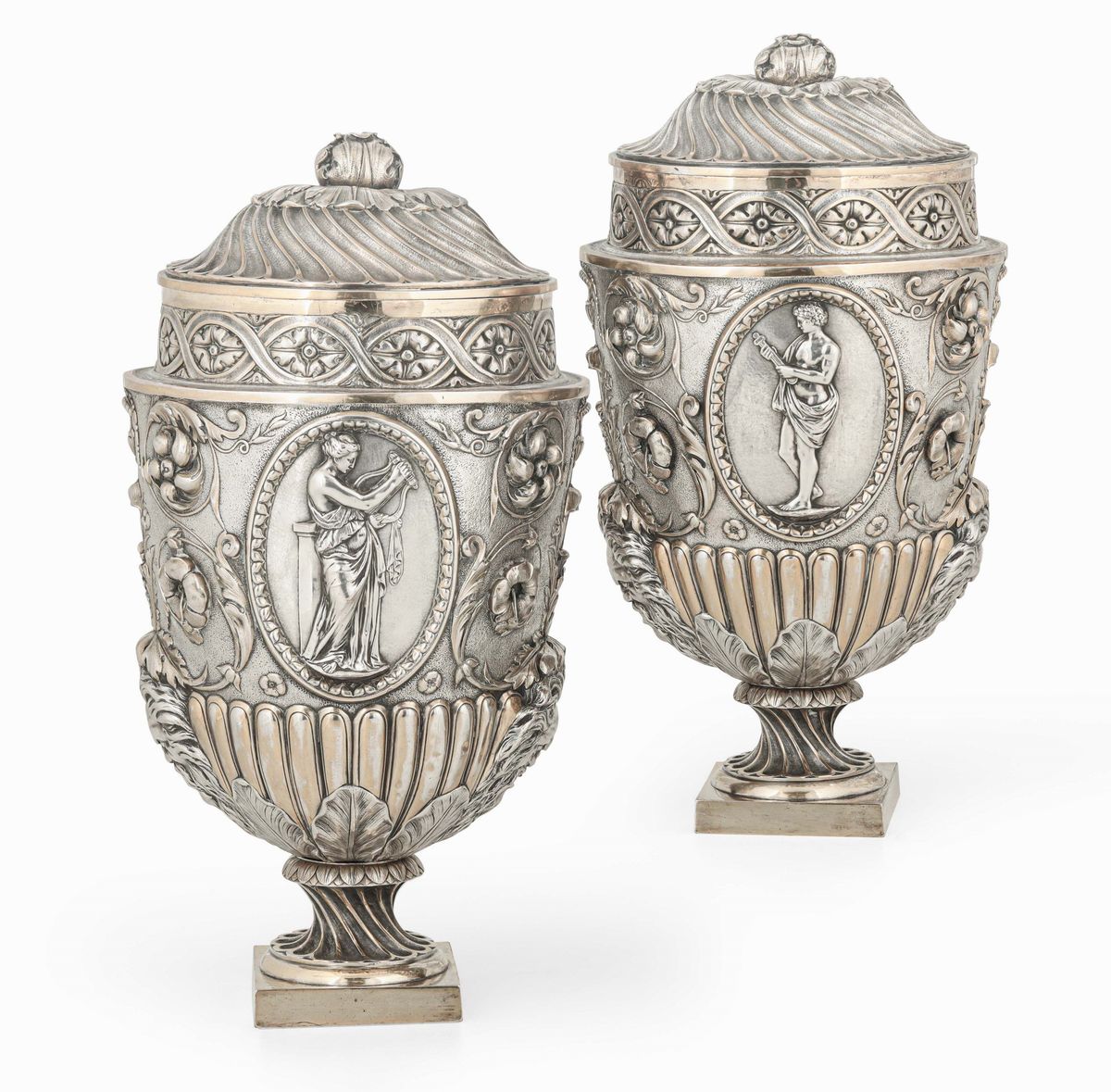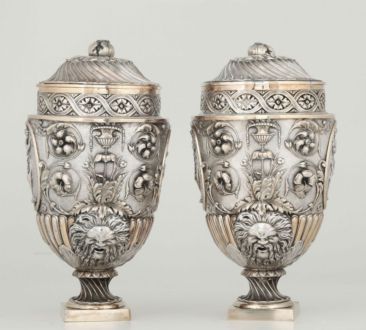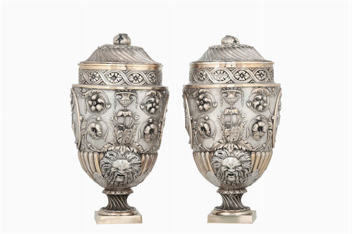 importante Coppia di Potiches. Metallo argentato e dorato Manifattura Elkington, Inghilterra XX secolo