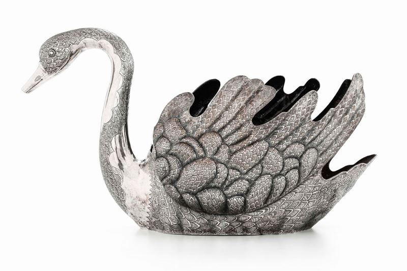 Monumentale centrotavola a foggia di cigno in argento fuso e cesellato. Persia XX secolo. Incussa iscrizione "VARTAN.A.O."