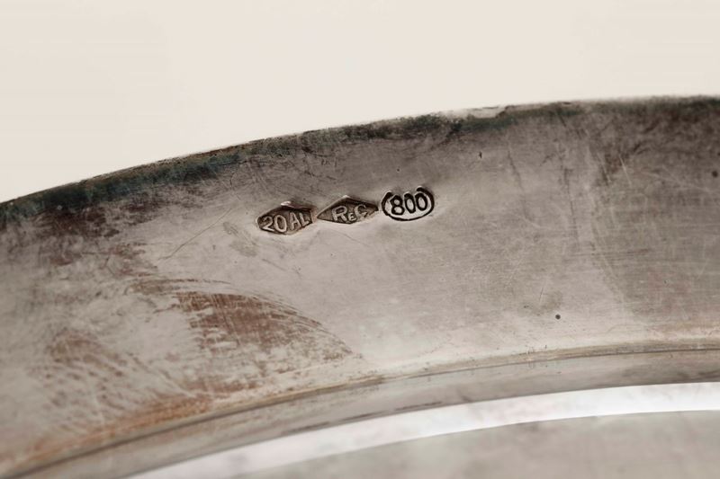 Portavivande in argento fuso e cesellato. Argenteria italiana inizio del XX secolo. Argentiere Ricci e C., Alessandria