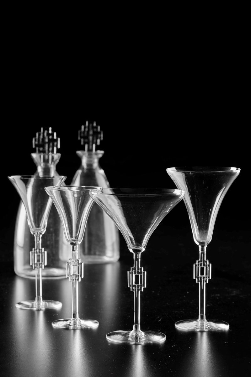 Il servizio completo per 6 persone conta 43 pezzi ed è così composto: 7 calici da acqua (altezza cm 20,7; di cui 1 con insignificante sbeccatura al bordo inferiore); 13 calici da vino rosso (altezza cm 18,7); 14 calici da vino bianco (altezza cm 17,9; di cui 2 con insignificante sbeccatura al bordo inferiore); 6 coppe da champagne (altezza cm 18,2; di cui 1 con insignificante sbeccatura al bordo inferiore); 3 bottiglie (altezza cm 26 circa; con depositi di calcare)