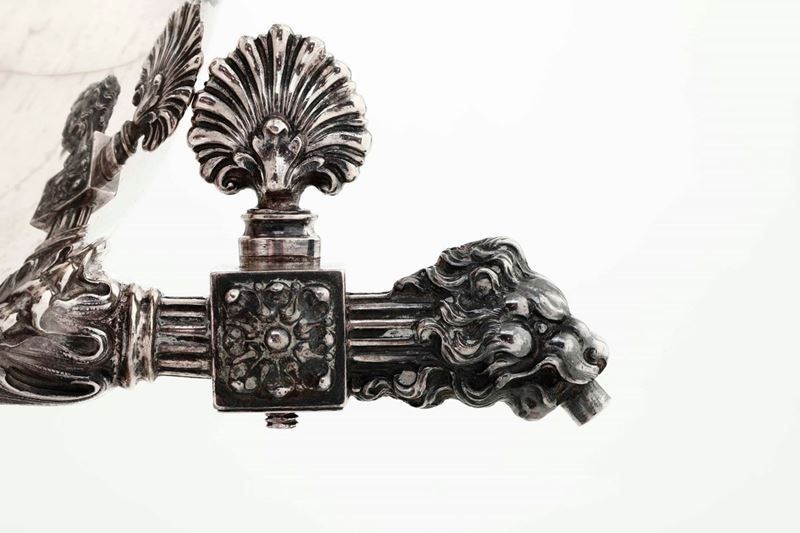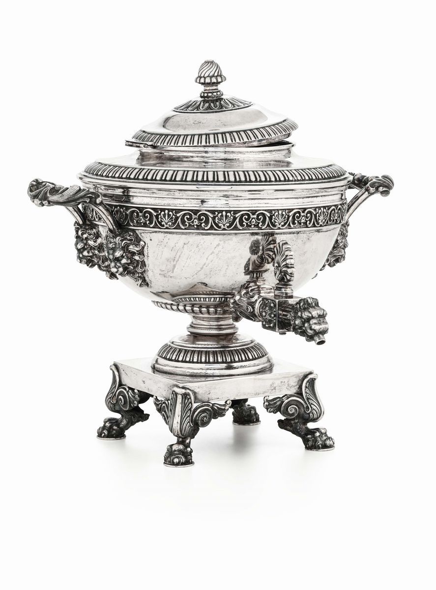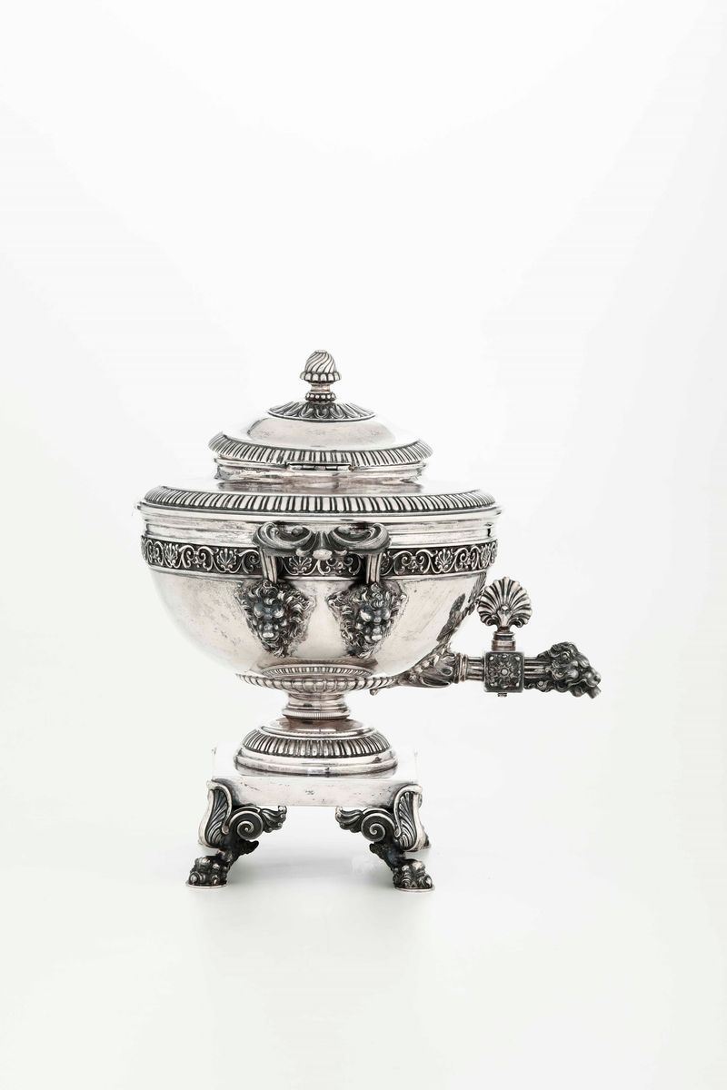 Samovar in argento sterling fuso e cesellato. Argenteria artistica italiana del XX secolo. Bollo con fascio littorio in [..]