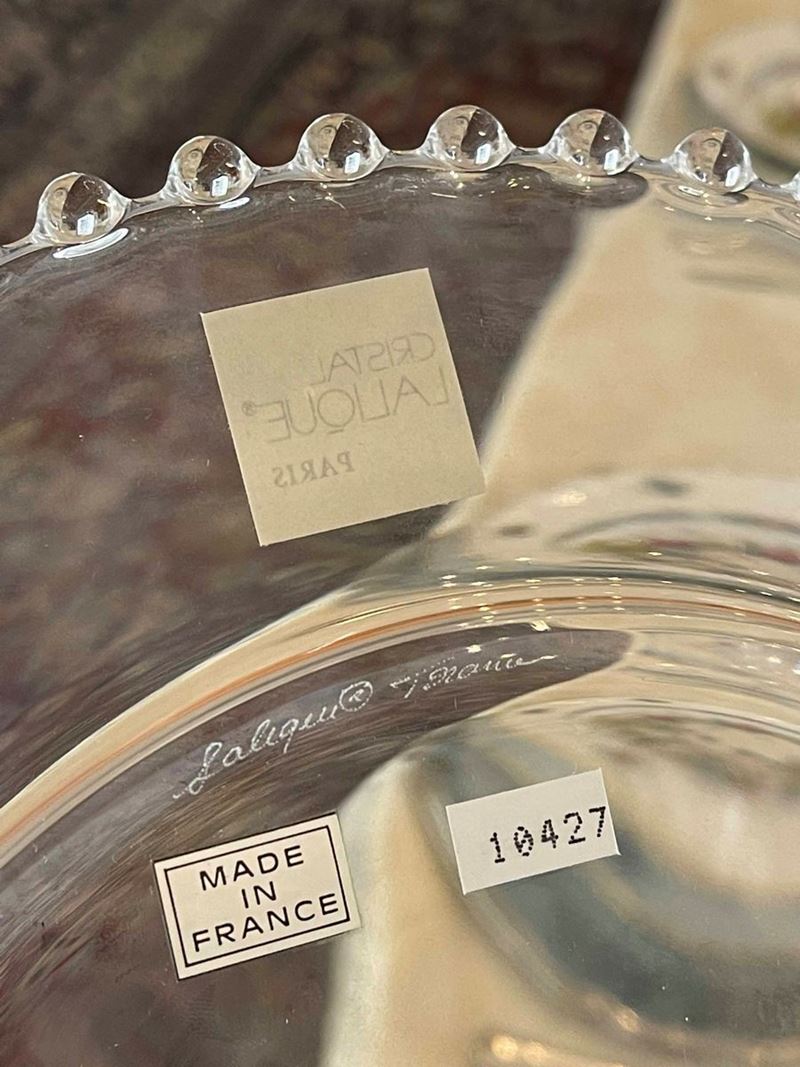 Cristallo trasparente con il bordo formato da una catena di perle. Modello creato nel 1933 da René Lalique. Marca: "Lalique France" incisa. Diametro cm 28,6. Conservazione: ottima