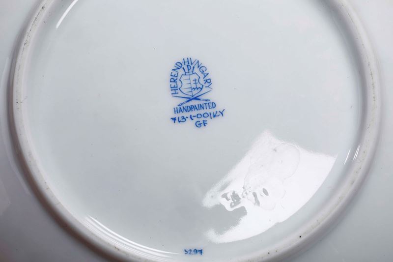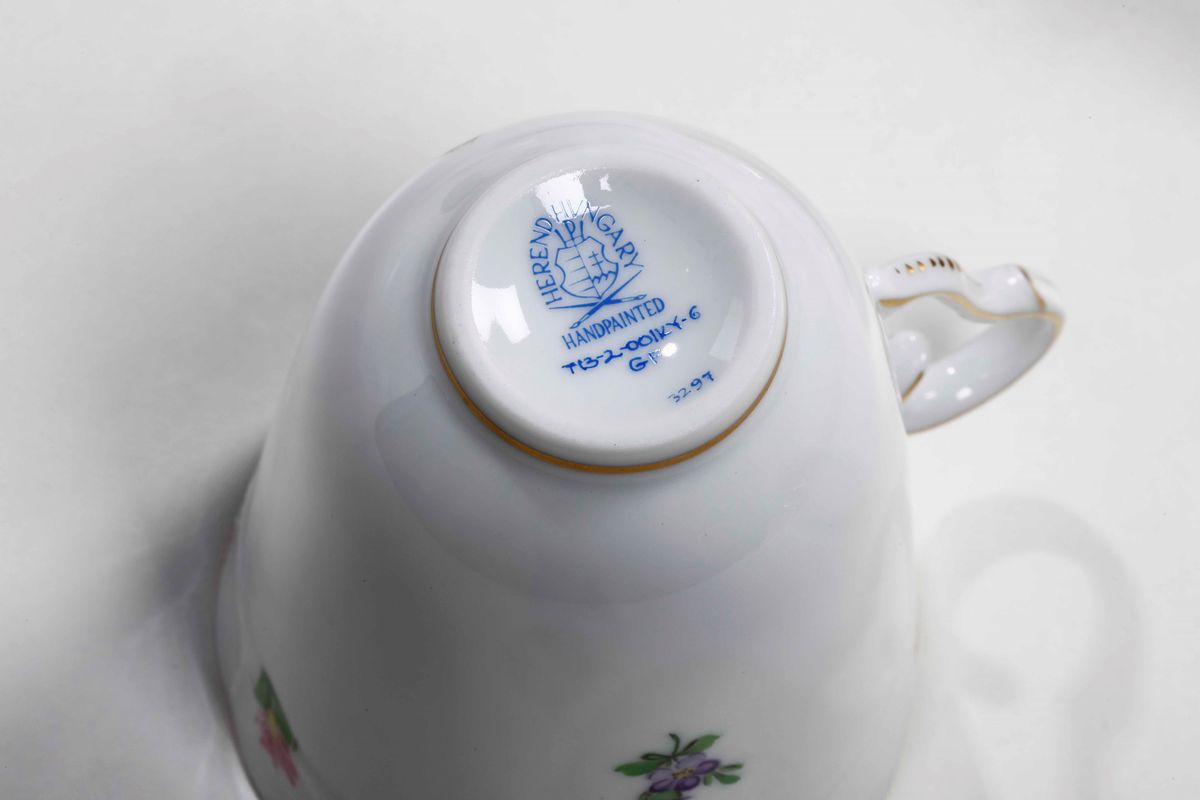 Porcellana. Marca: "Herend Hungary Handpainted" e stemma in blu; Herend inciso. Dimensioni: altezza tazza cm 8,3; diametro piattino cm 13,8. Conservazione: ottima