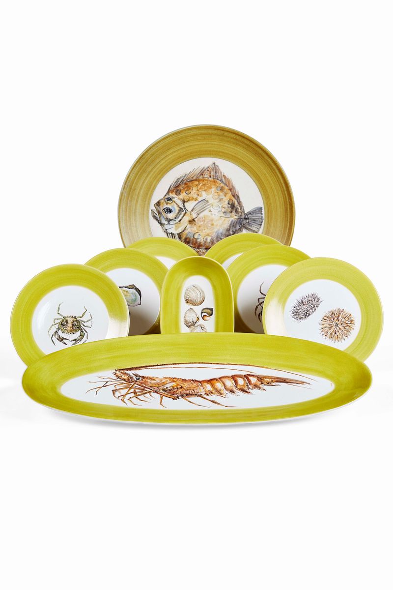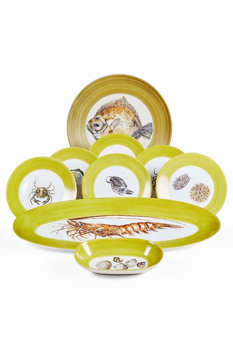 Il servizio conta 9 pezzi ed è così composto: 6 piatti piani (diametro cm 24); 1 piatto da portata da pesce (cm 63,5x25,5); 1 vassoietto ovale (cm 24x15); 1 piatto da portata rotondo (diametro cm 42,8)