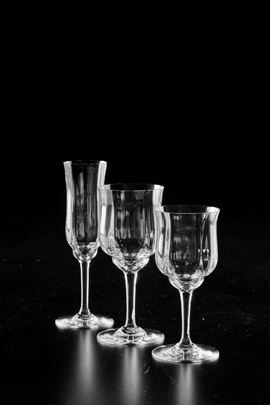 Il servizio per 18 persone conta 54 pezzi ed è così composto: 18 calici da acqua (altezza cm 16,6); 19 calici da vino (altezza cm 15,2); 17 flûtes (altezza cm 18,8)