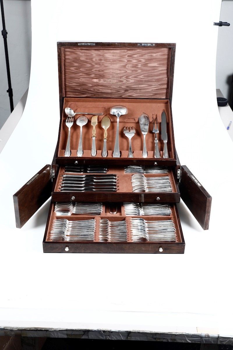 Composto da 11 posate da portata di varie misure, 12 coltelli, forchette e cucchiai, 12 coltelli e forchette da pesce, 12 coltelli, forchette e cucchiai medi, 12 cucchiaini da caffè.