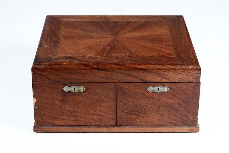 Impugnatura sagomata con monogramma SC inciso al cesello, custodito in cassetta di mogano intarsiato.