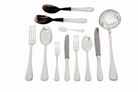 composto da 12 cucchiai, 12 forchette, 12 coltelli, 12 coltelli piccoli, 12 forchette piccole,12 cucchiaini,3 posate da portate e due posate da insalata