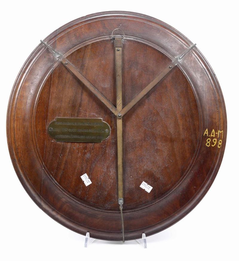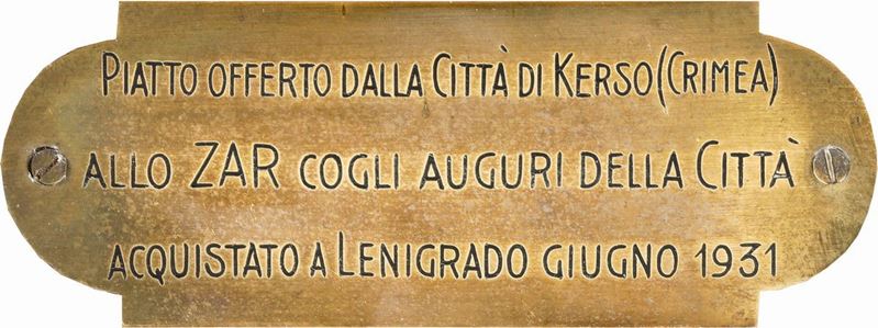 Sul retro targa in ottone con iscrizione: “Piatto offerto dalla città di Kerso (Crimea) allo Zar con gli auguri della città. Acquistato a Leningrado giugno 1931”.
