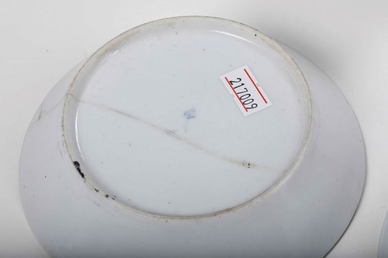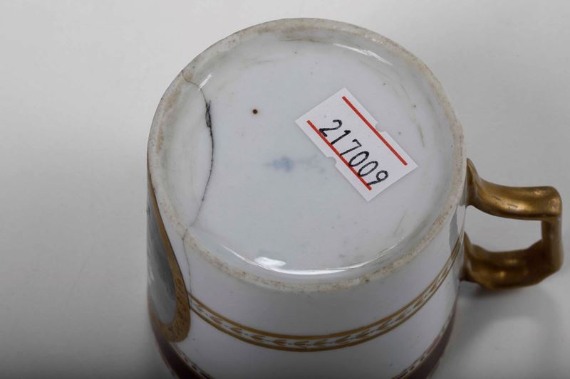 Porcellana. Marca: “A” con corona, in blu. Altezza tazza: cm 6,4; diametro piattino: cm 13,4. Conservazione: piattino con piccola rottura al bordo e felatura, riconsolidate in restauro; tazza con felatura