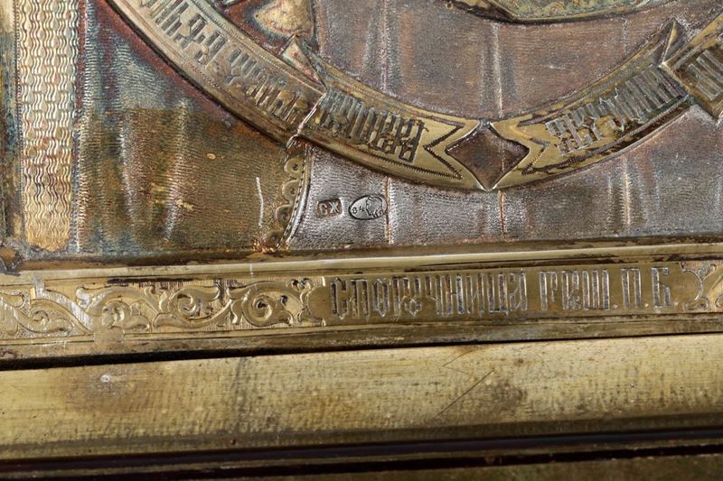 Trittico da viaggio raffigurante la Veringe e i Santi Nicola e Innochentij. Riza in argento sbalzato e cesellato e smalti policromi cloisonnè. Russia (Riga?) XIX-XX secolo. Bollo in uso dal 1896 al 1908.