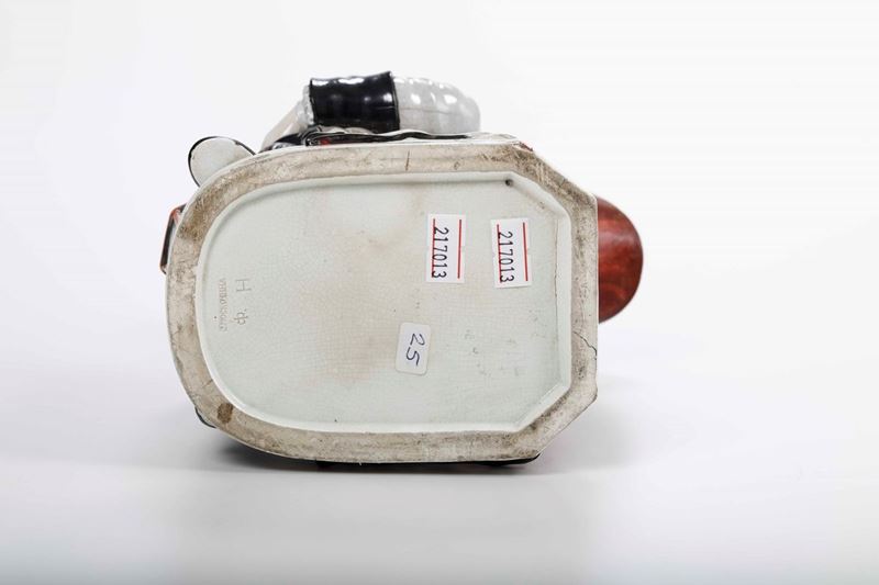 Porcellana policroma. Marca: impressa in cirillico. Altezza: cm 23,4. Conservazione: buona; piccole mancanze e sbeccature alla base di cui alcune riprese in vecchio restauro; punta del beccuccio restaurata