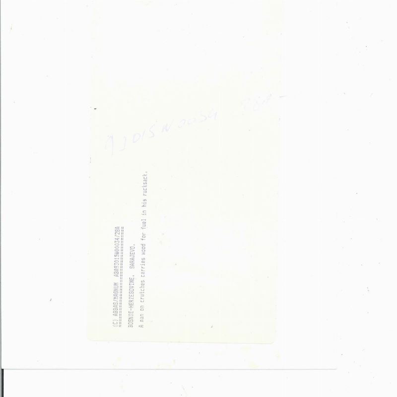Attar Abbas (1944-2018) A man on crutches carries wood for fuel in his rucksack. Bosnie-Herzigovine, Sarajevo