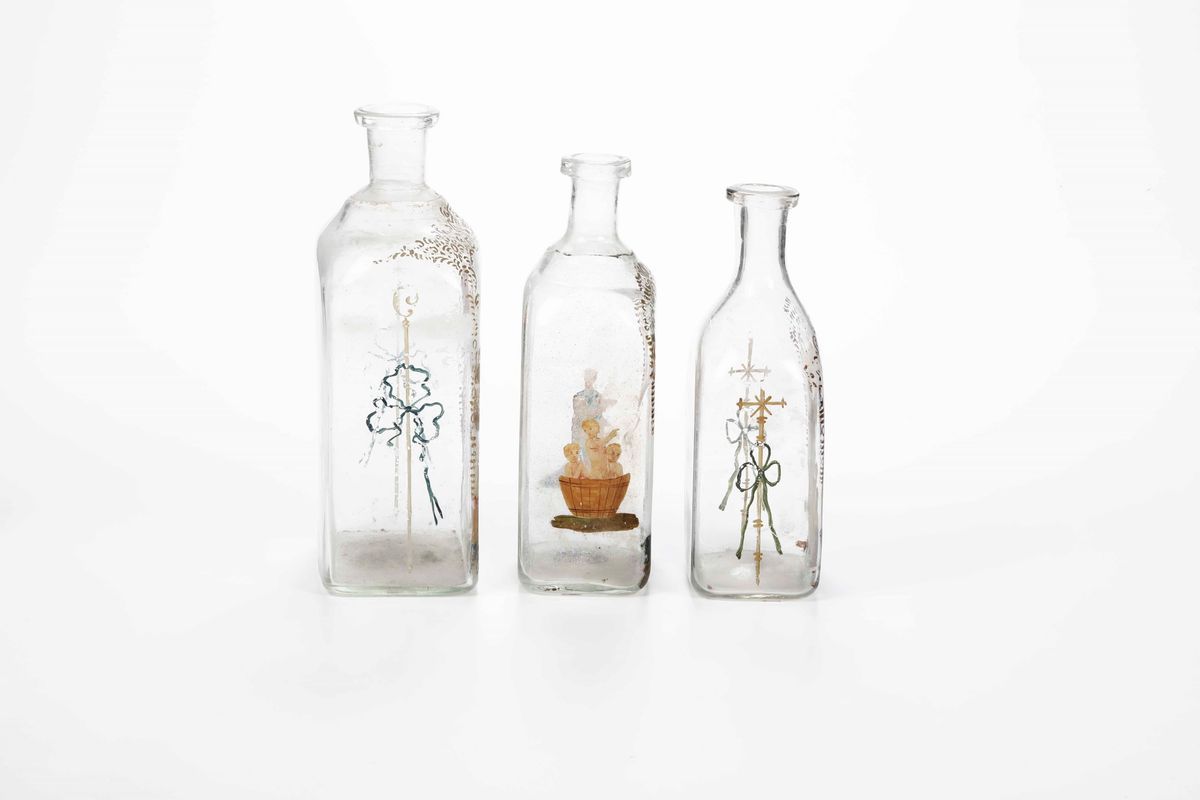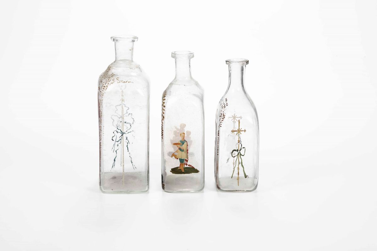 Gruppo di tre bottiglie per la manna in vetro soffiato incolore decorate con immagini di San Nicola e dei suoi miracoli. Italia XVIII secolo