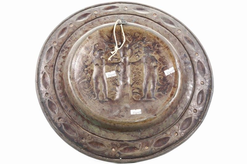 Piatto elemosiniere in ottone sbalzato. Germania XVI secolo