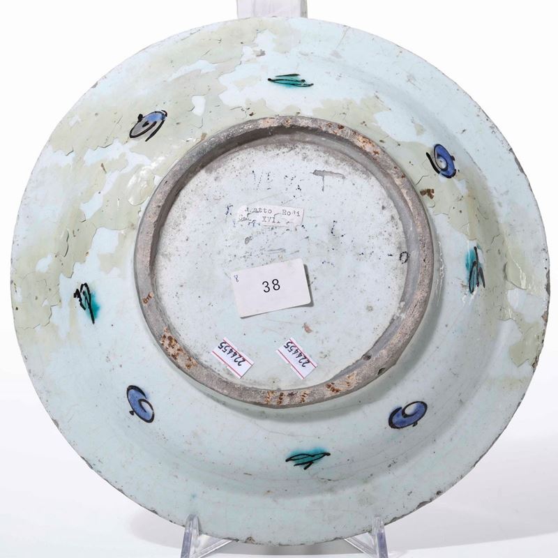 Ceramica silicea. Diametro cm 30. Conservazione: rotto in 4-5 frammenti e ricomposto in restauro