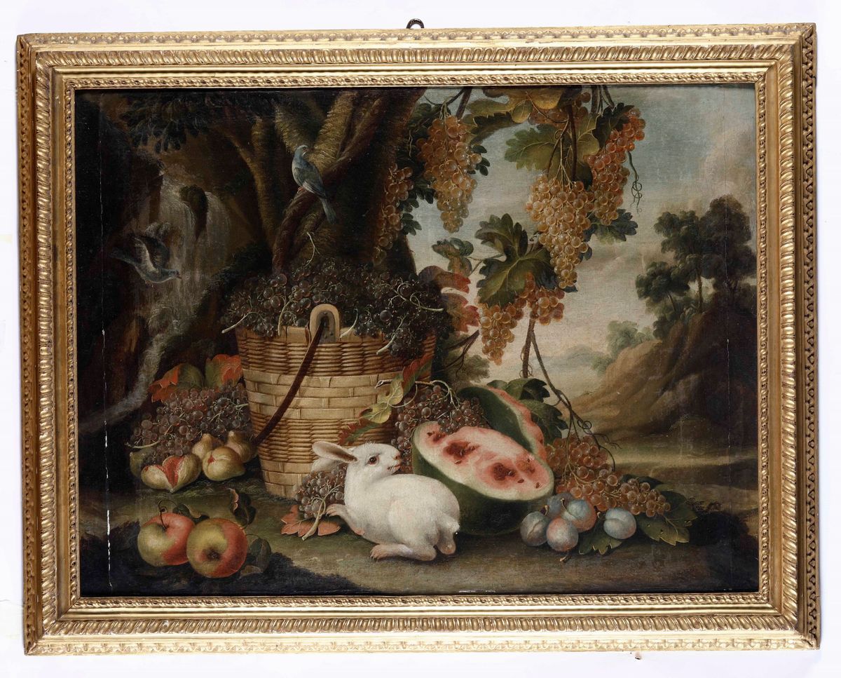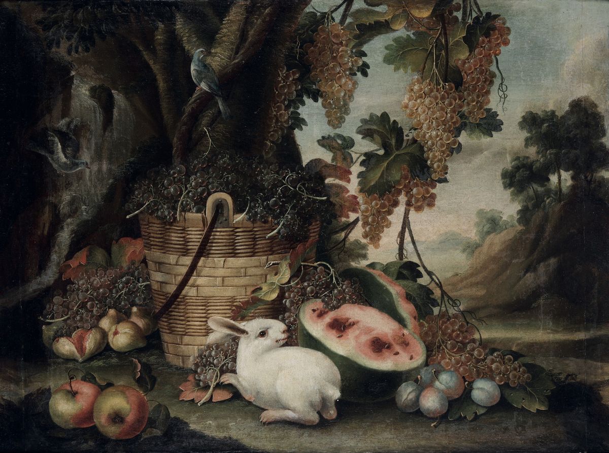 Scuola lombardo-piemontese del XVIII secolo Natura morta con uva, anguria e coniglietto