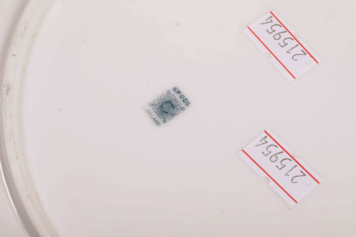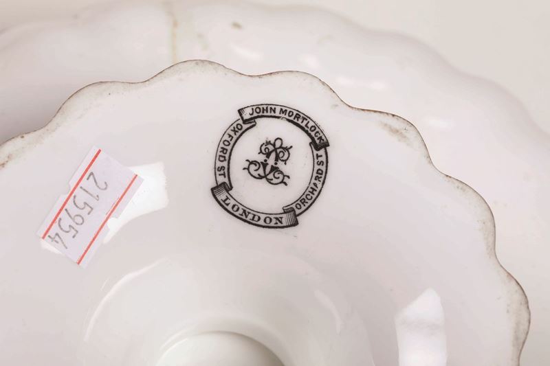Porcellana policroma. Marca: simbolo grafico della manifattura con “Spode” “Copeland” in verde; simbolo grafico in nero con “John Mortlock London, Oxford St, Orch/Rd St”.