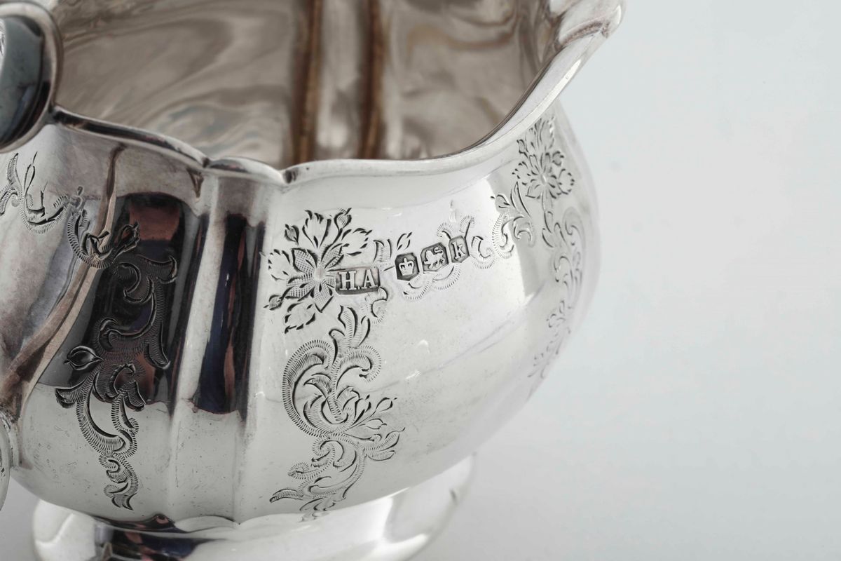 Servizio da tè e caffè in argento fuso, sbalzato e cesellato. Inghilterra XX secolo. Marchi della città di Sheffield per l’anno 1927 e dell’argentiere H.A. (non identificato)