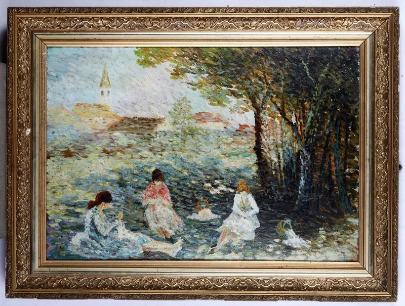 Riposo sul prato, Serper Natura Morta con fiori, Berland Paesaggio, Anonimo: Pescherecci in porto, G. Franchi:Fienile