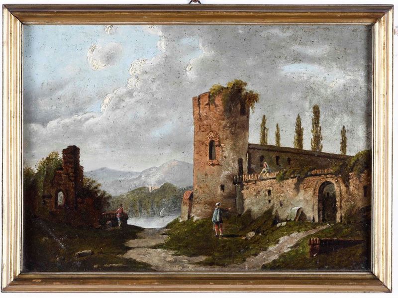Scuola del XIX secolo Scena cavalleresca Paesaggio con figure