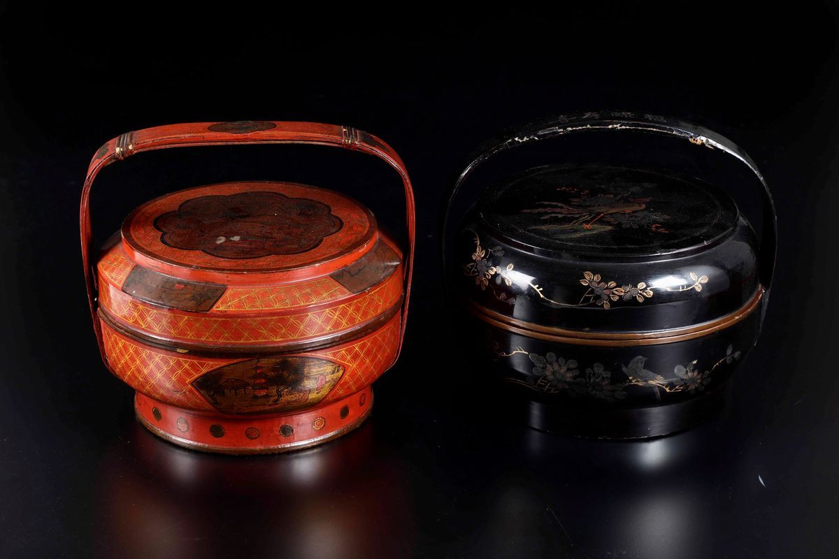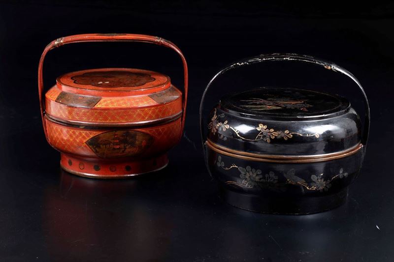 Due portavivande in legno laccato con motivi floreali e scene naturalistiche, Cina, Dinastia Qing, XIX secolo