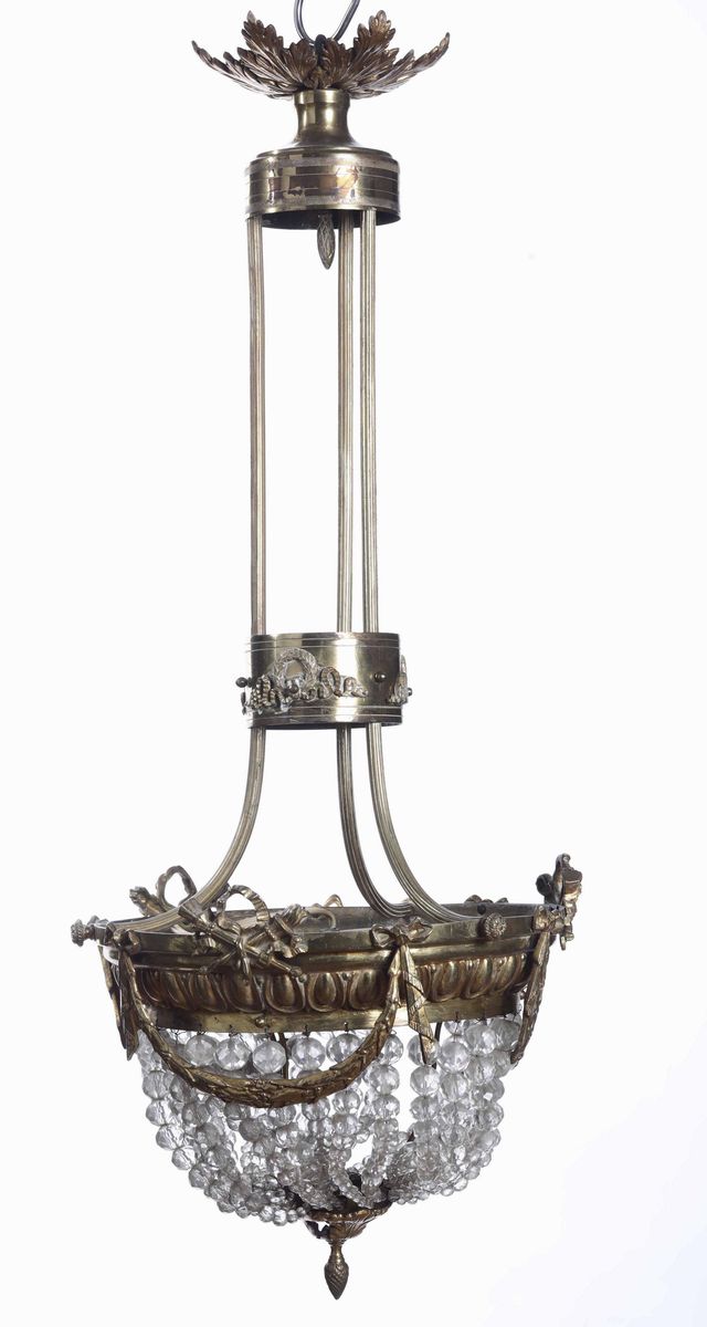 Lampadario in metallo dorato e cristalli, XX secolo