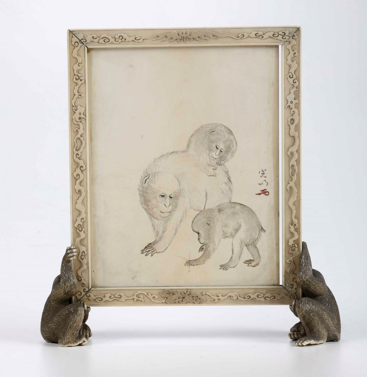 Piccolo pannello in avorio sorretto da scimmiette. Giappone, XIX secolo