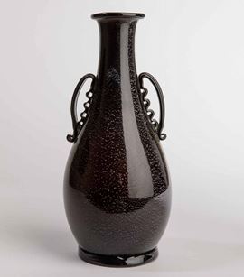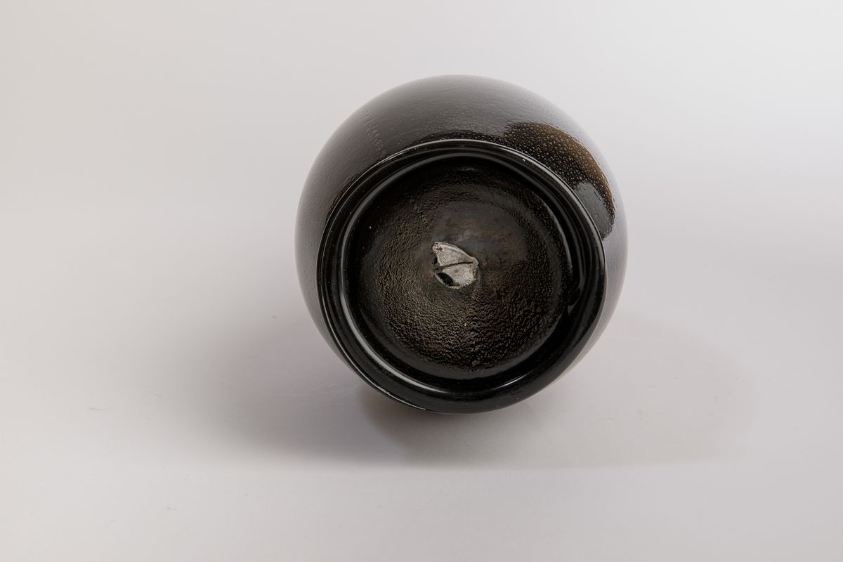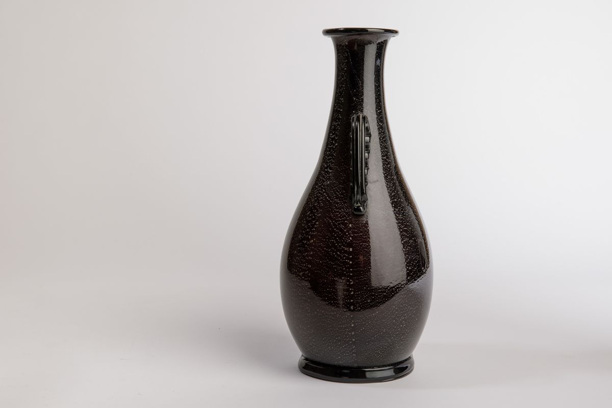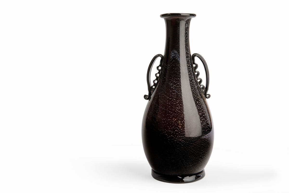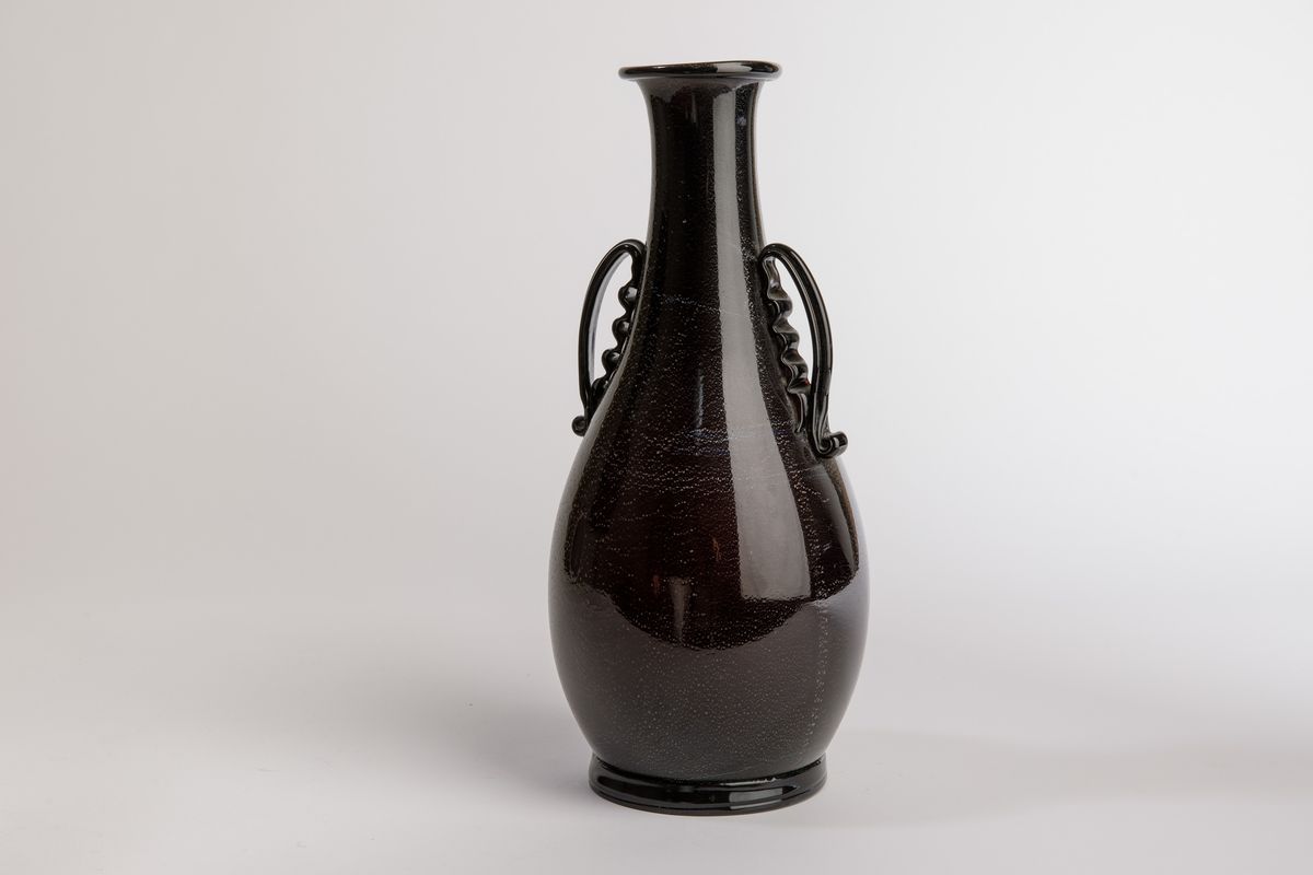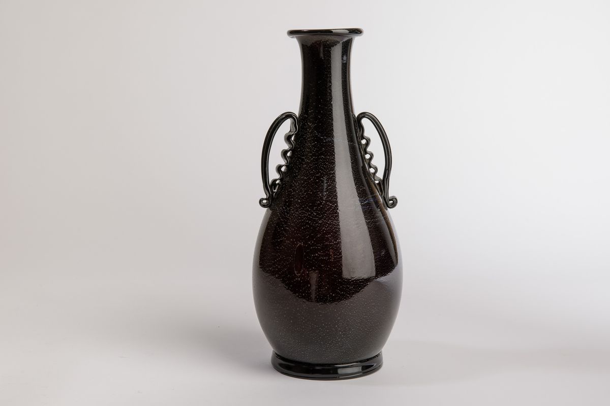 Vaso ad anfora in vetro soffiato nero con decoro di foglia d'argento. Anse e piede applicati.