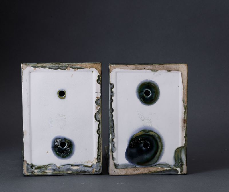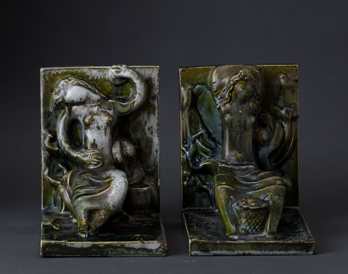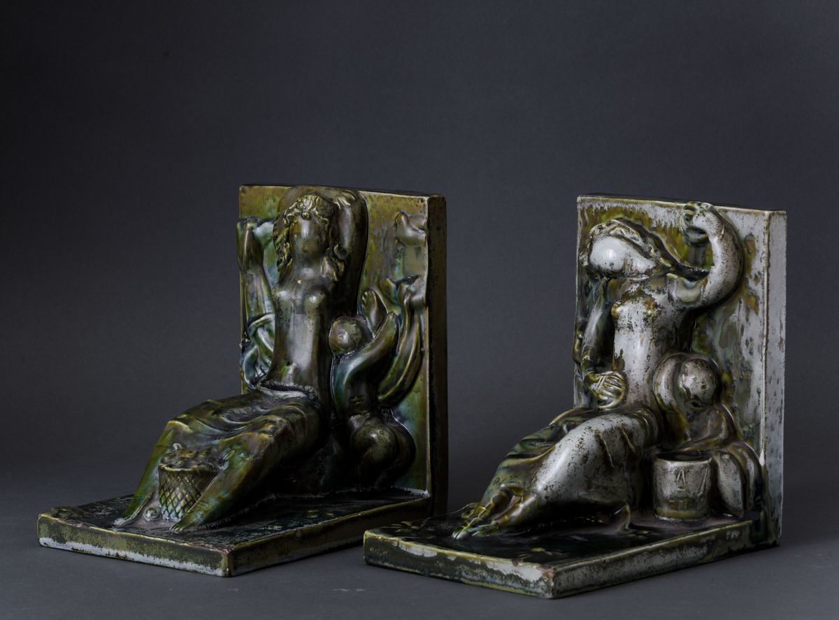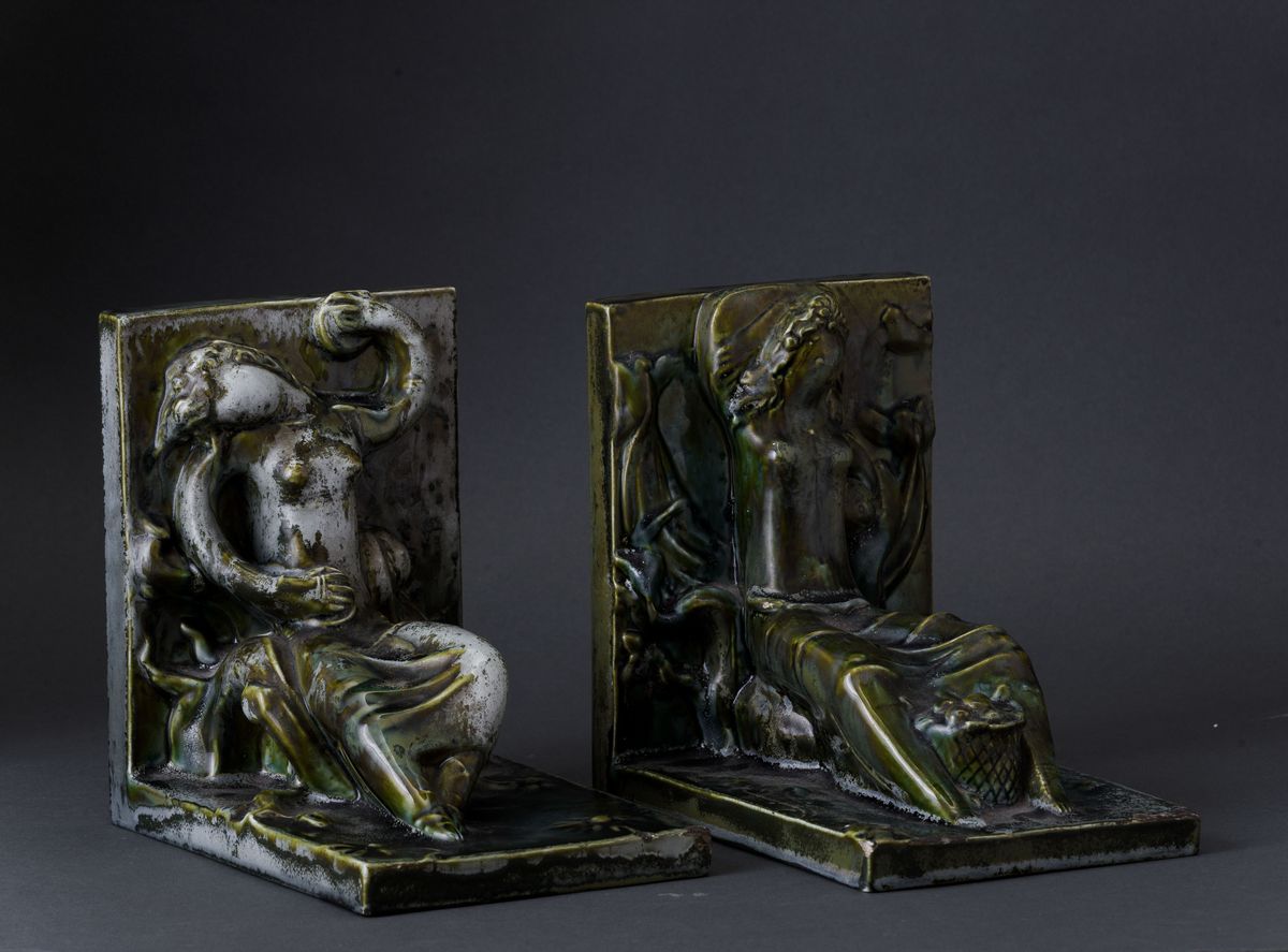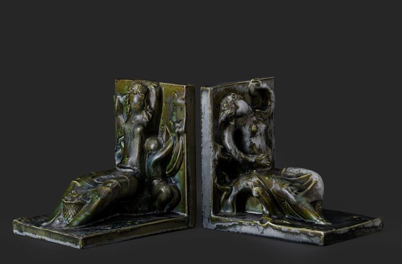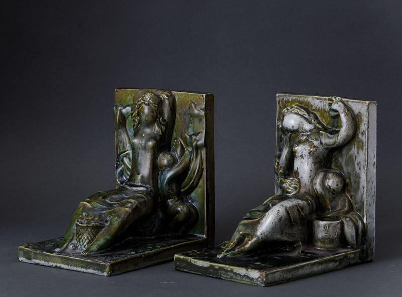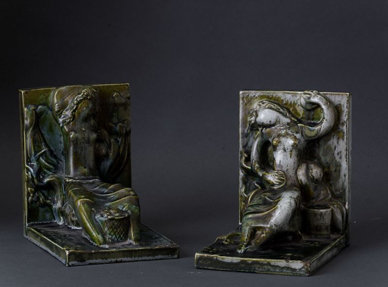 Rara coppia di fermalibri in terraglia modellata con decoro di figure di donne con strumenti musicali e canestra di frutta. Smalti colati policromi.