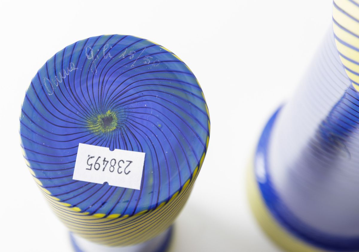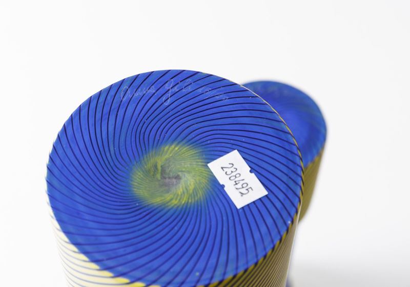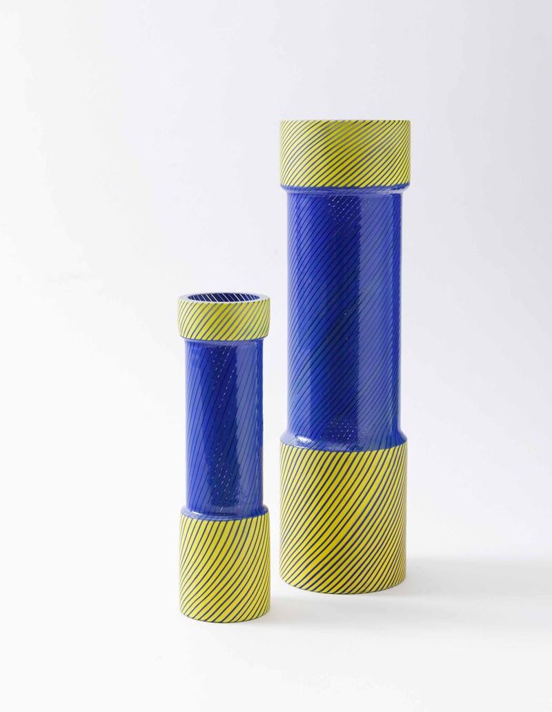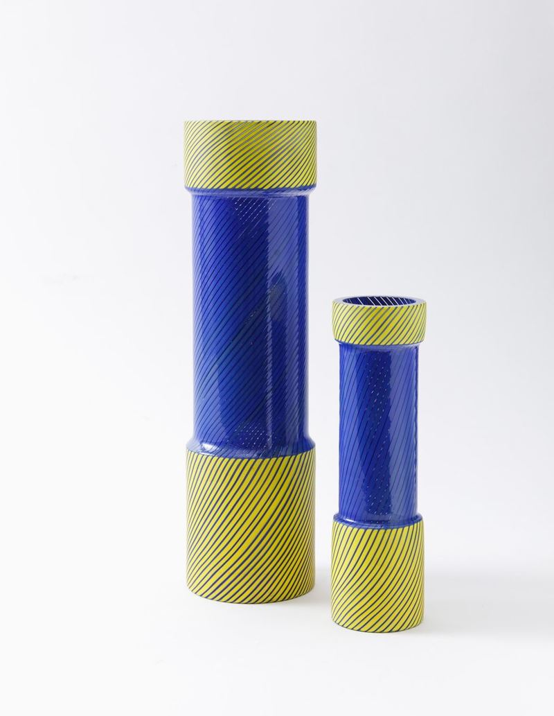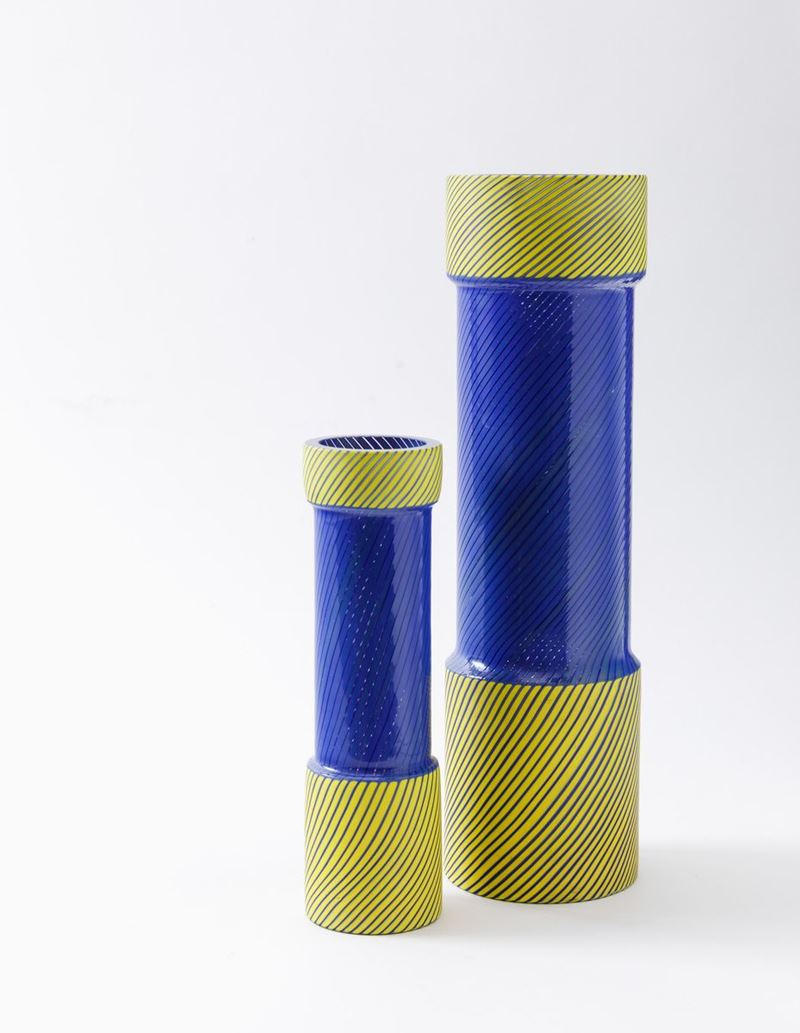 Due vasi a cilindro in vetro soffiato a stampo con decoro di canne sommerse gialle e blu.