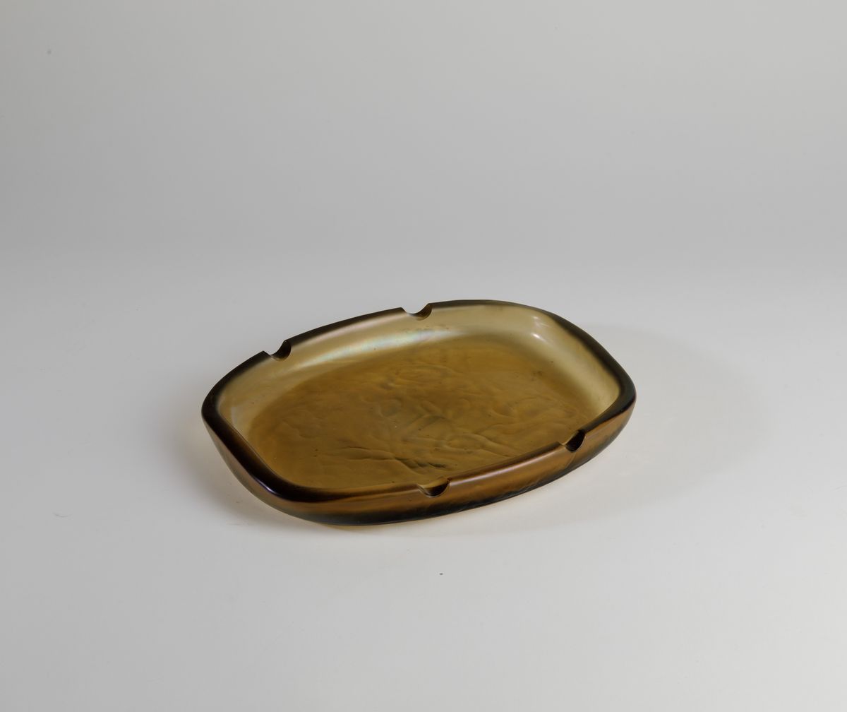 Vassoio ovale in vetro pesante iridato con tacche molate laterali.