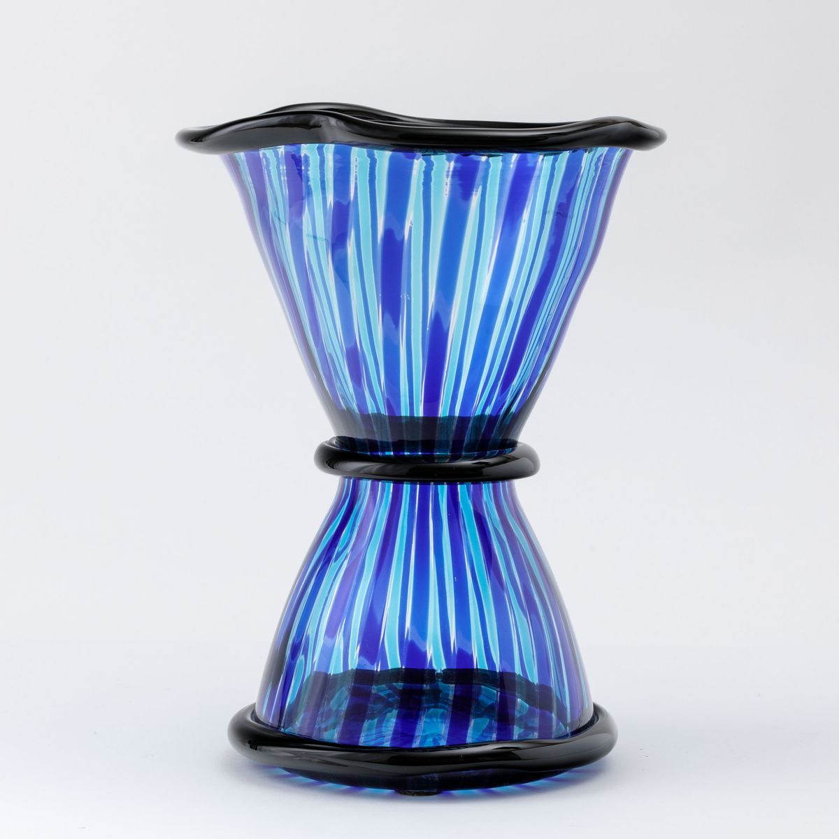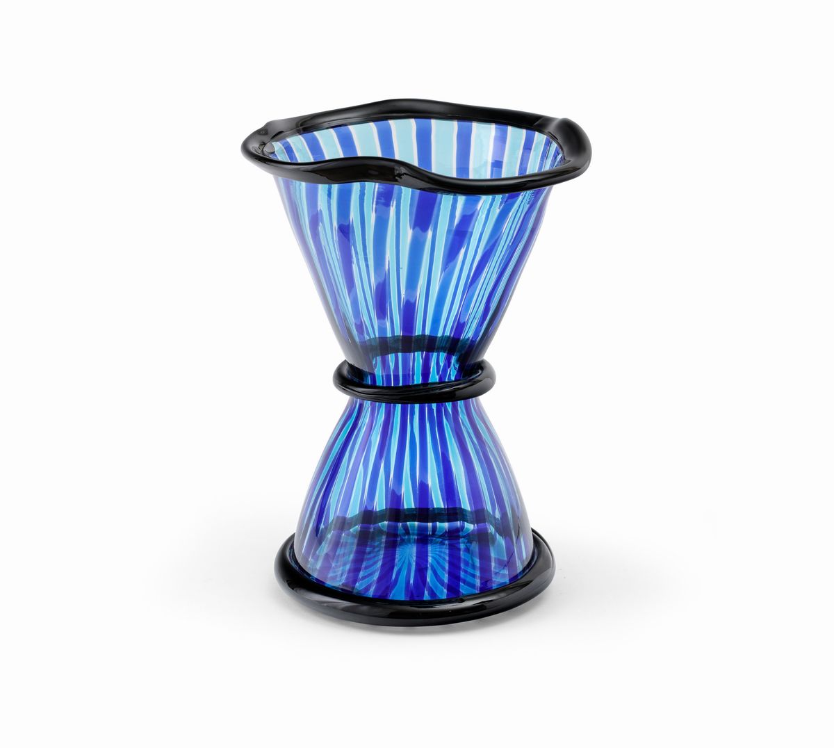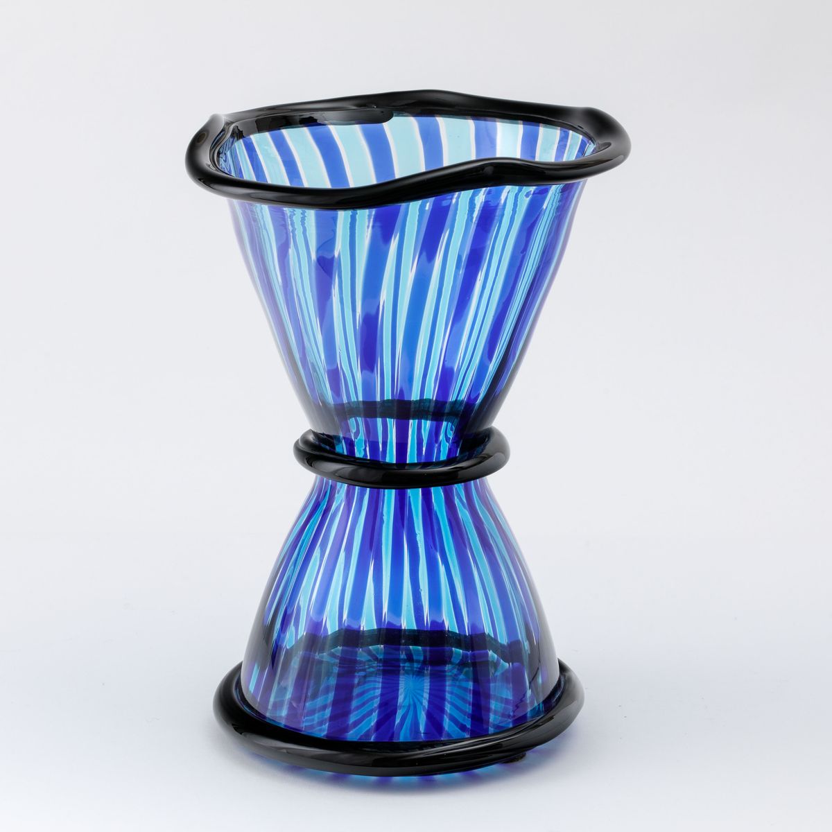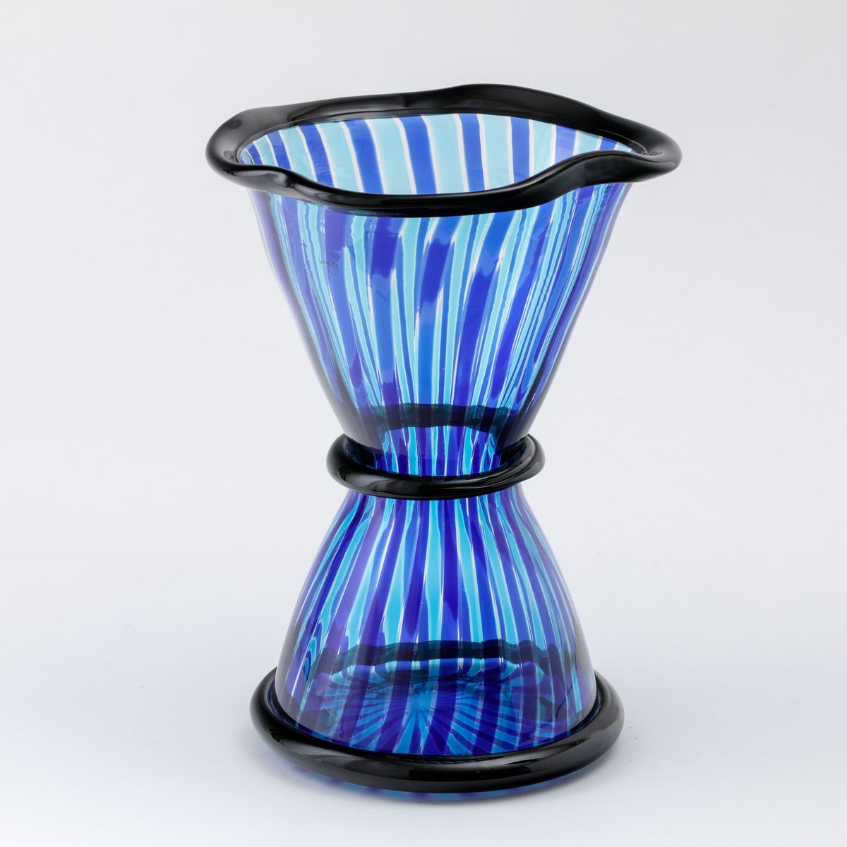 Grande vaso a clessidra in vetro soffiato con decoro di canne policrome e cordoni applicati.