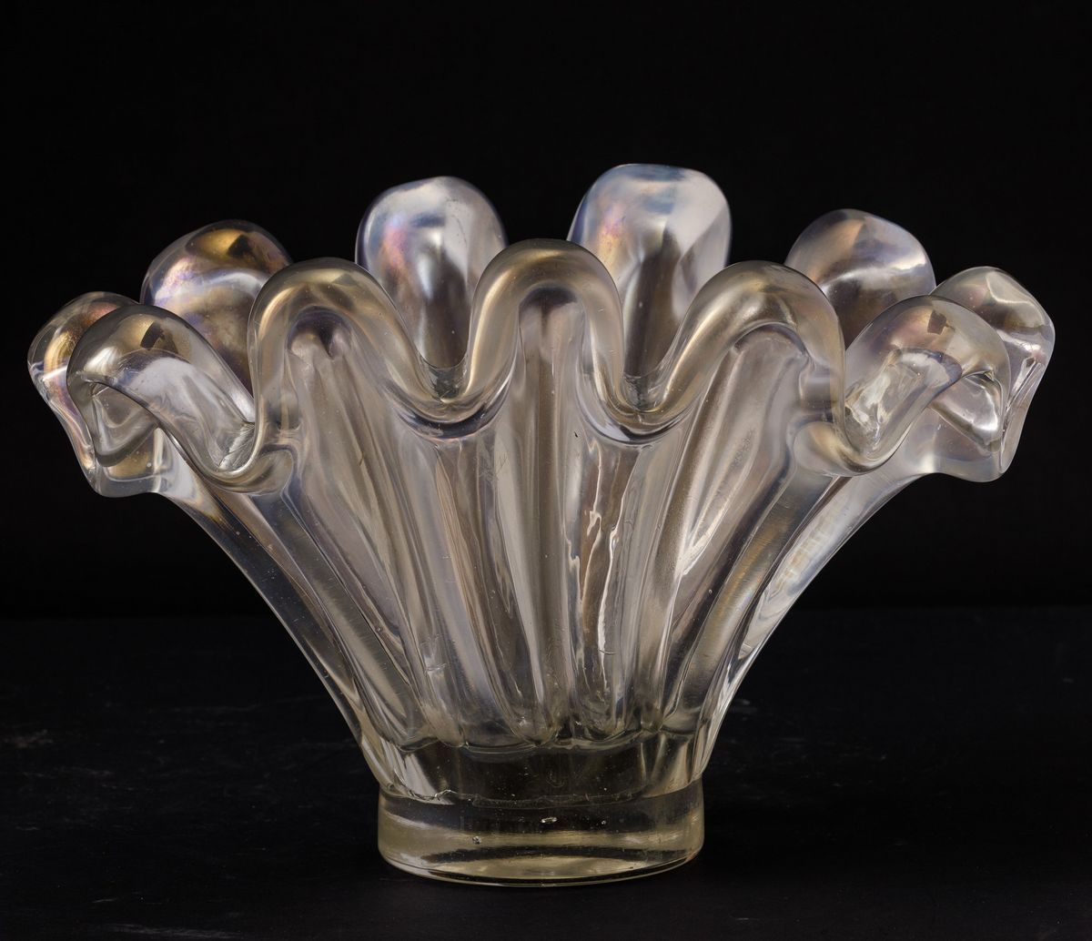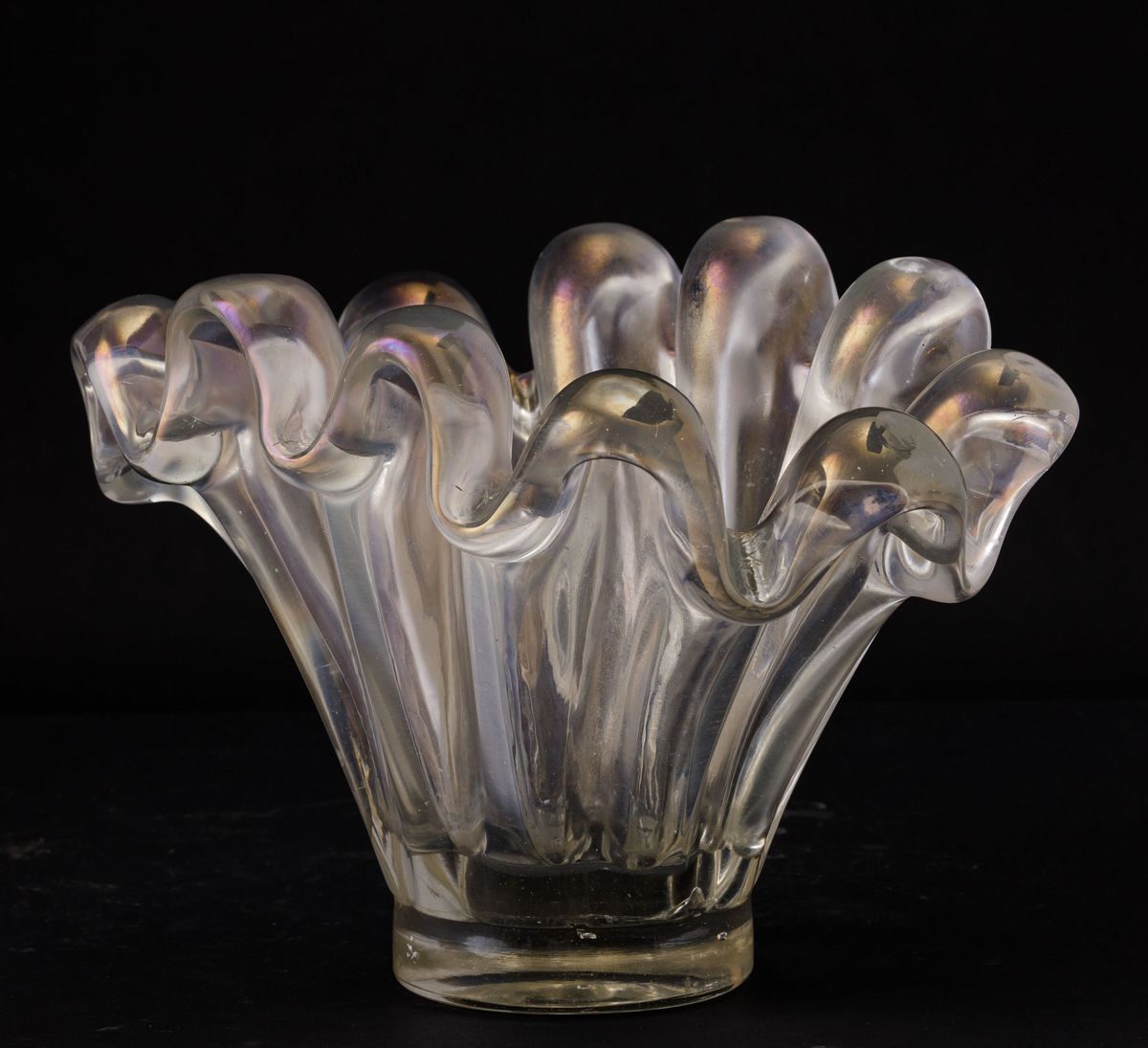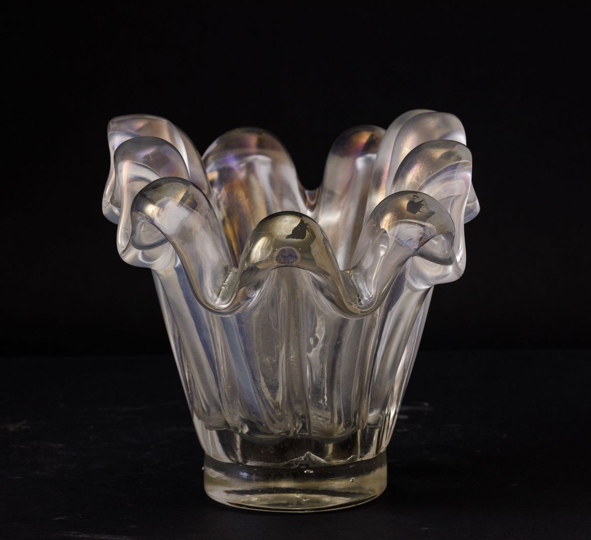 Vaso a ventaglio serie A Grosse Costolature in vetro soffiato pesante con decoro di applicazioni. Superficie interamente iridata.