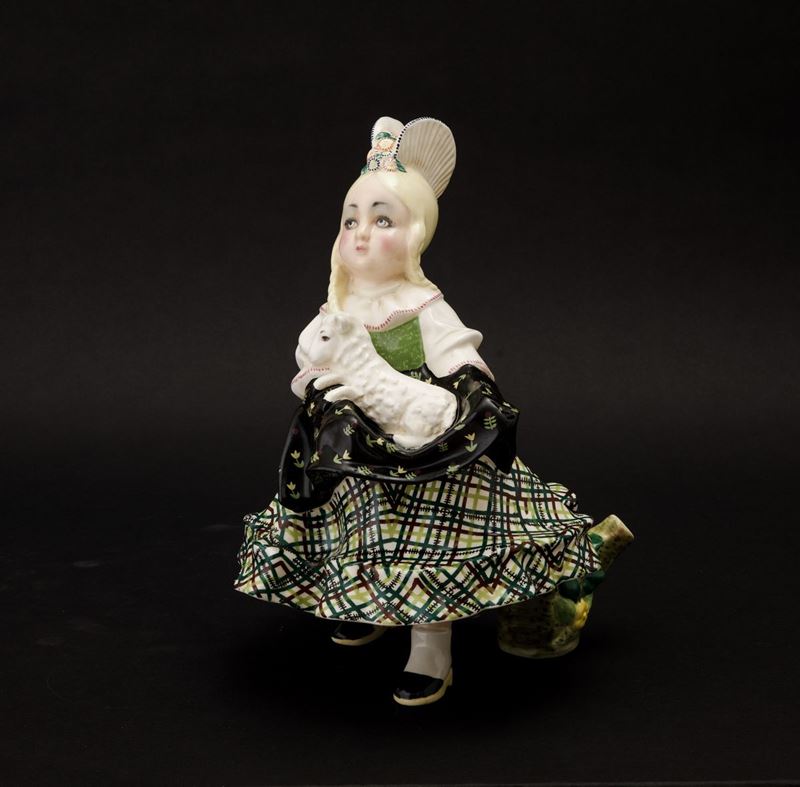 Scultura raffigurante bambina in costume regionale con agnello in grembo in terraglia a colaggio con decoro policromo.