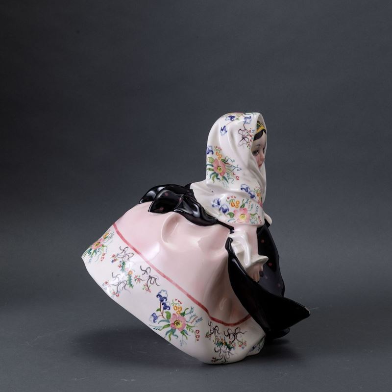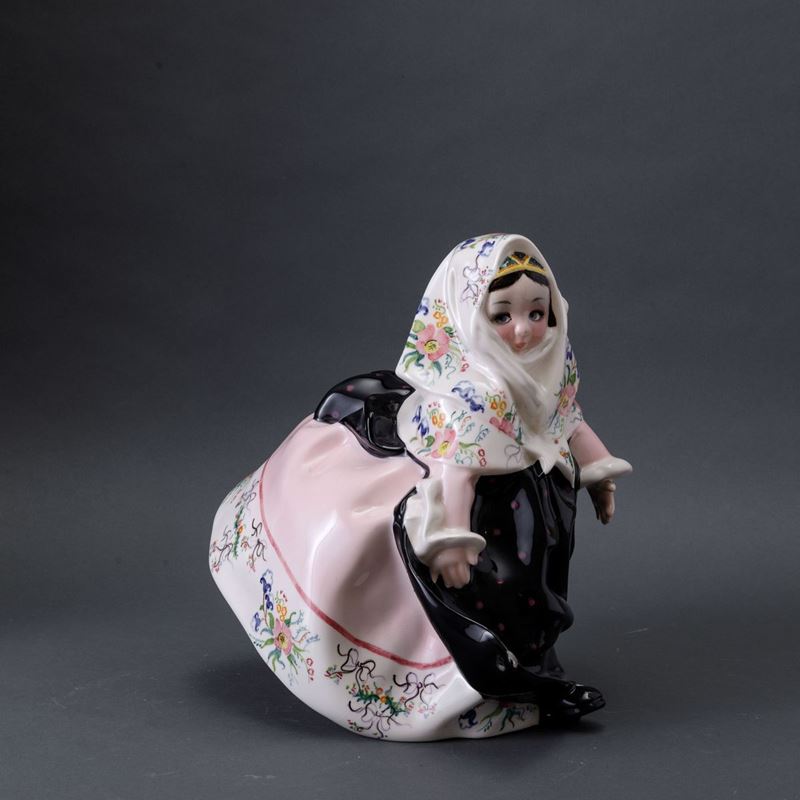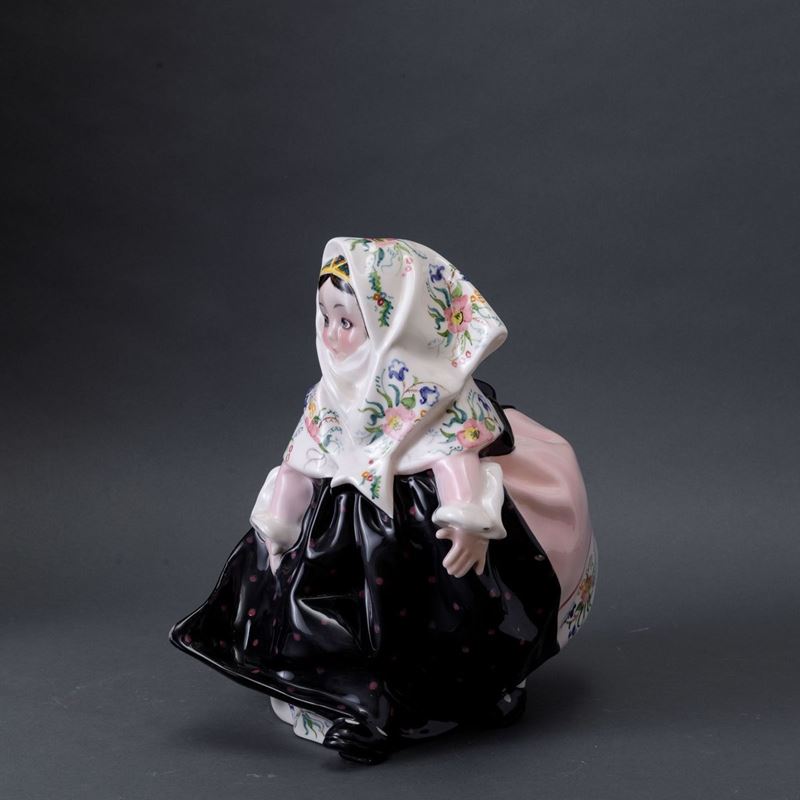Scultura raffigurante bambina con costume tradizionale sardo in terraglia a colaggio con decoro a smalti policromi.