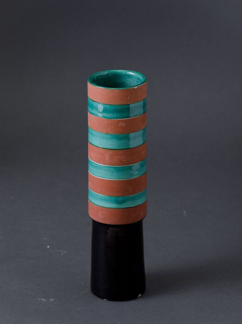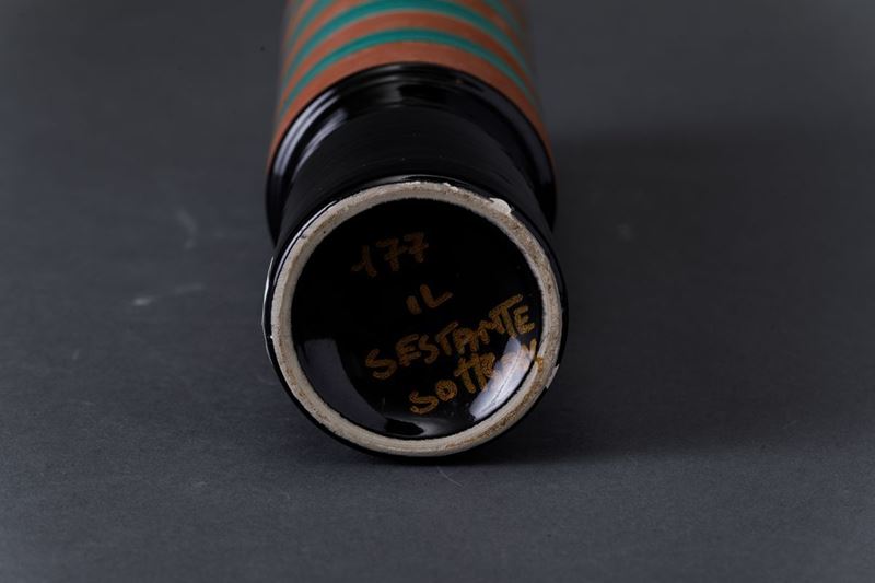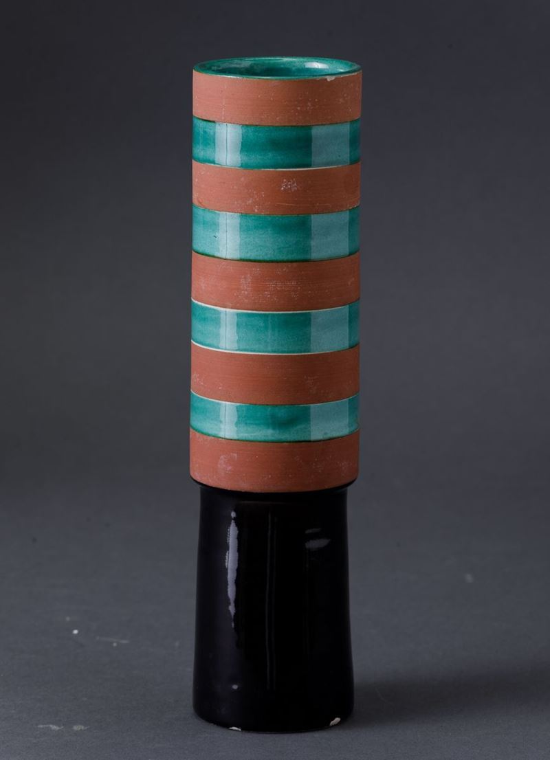 Vaso cilindrico su alto piede troncoconico nero in ceramica con decoro di fasce orizzontali a smalti policromi.