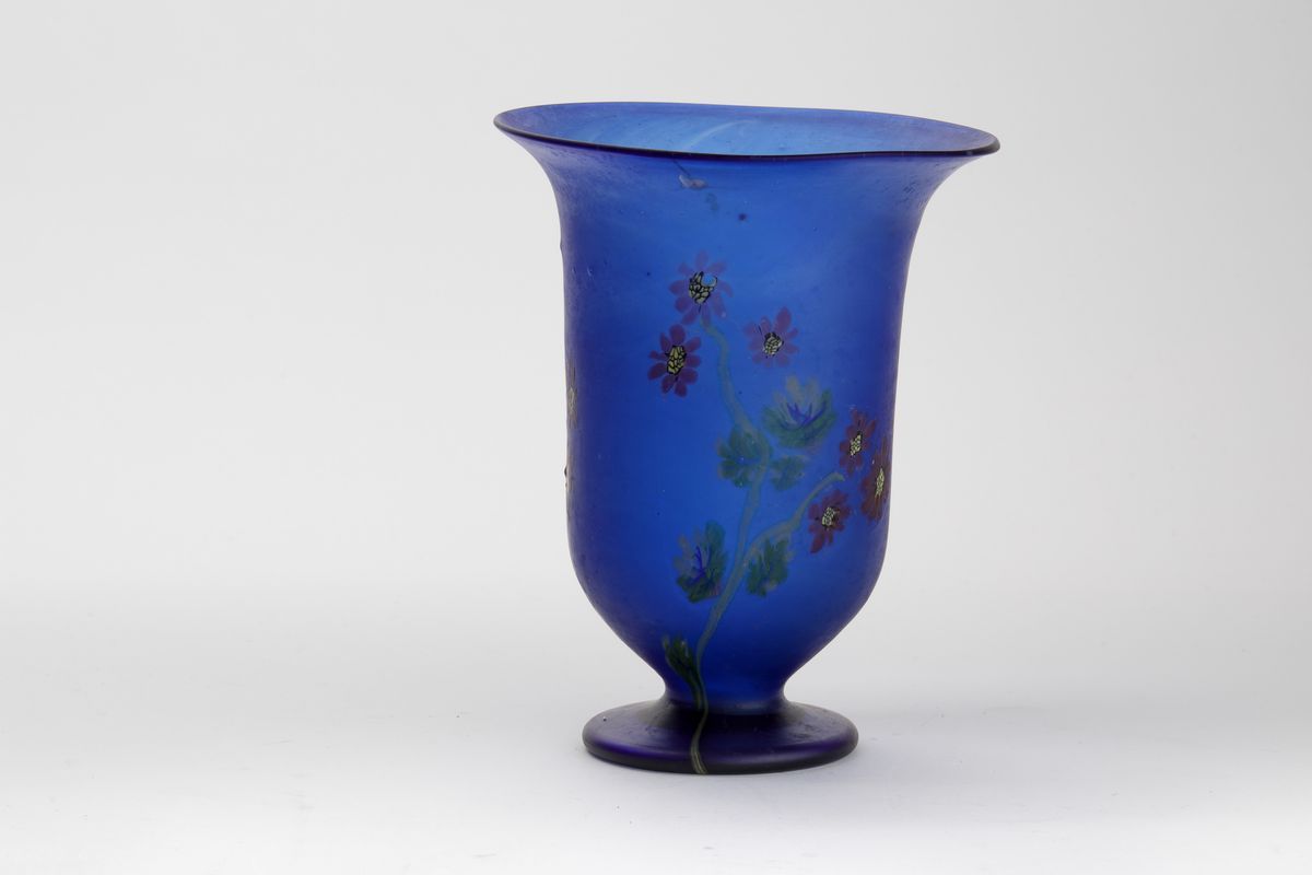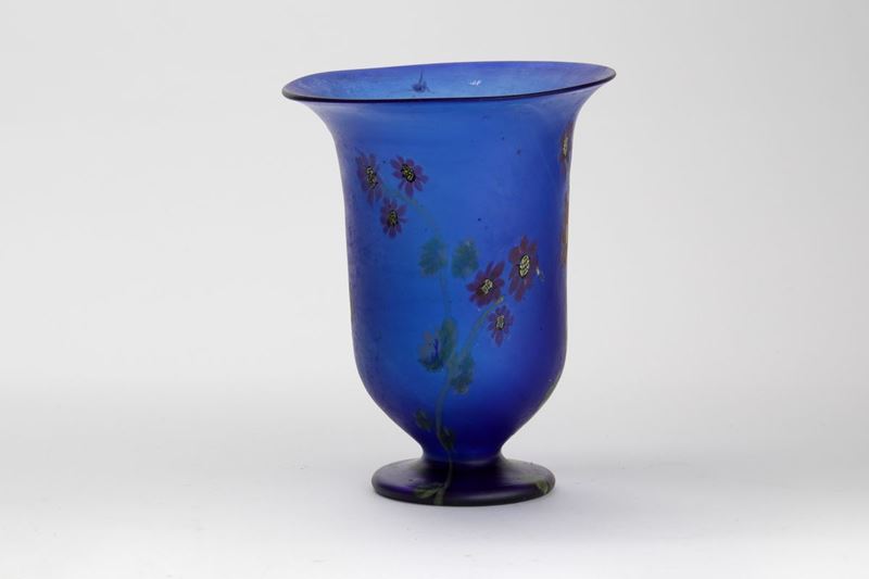 Vaso a campana rovesciata in vetro soffiato blu con decoro di rami e fiori realizzati con canne e murrine policrome.