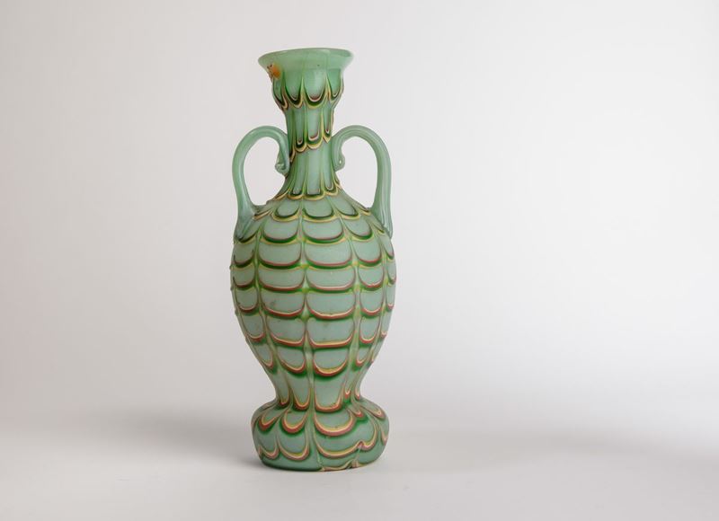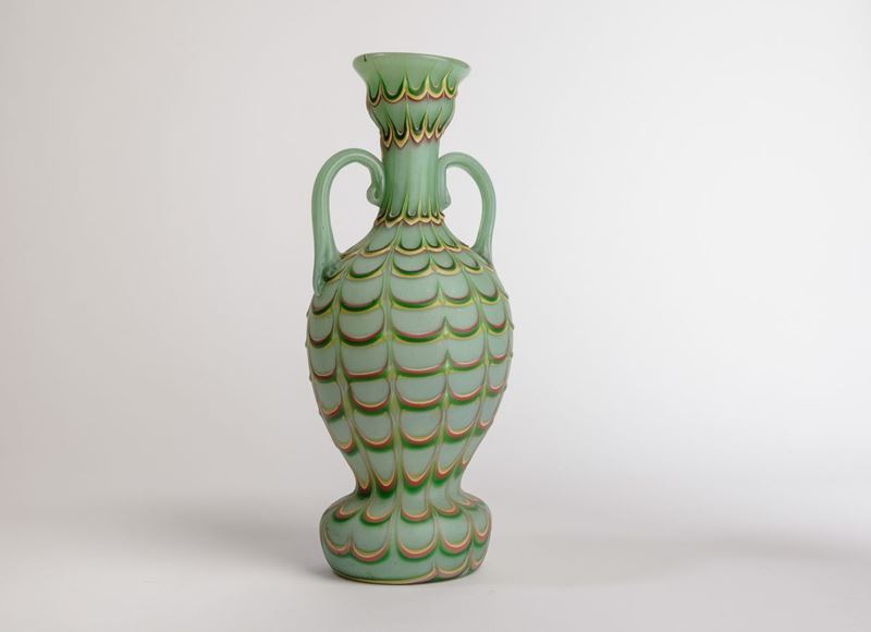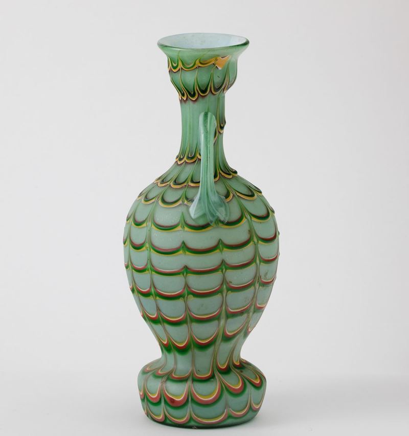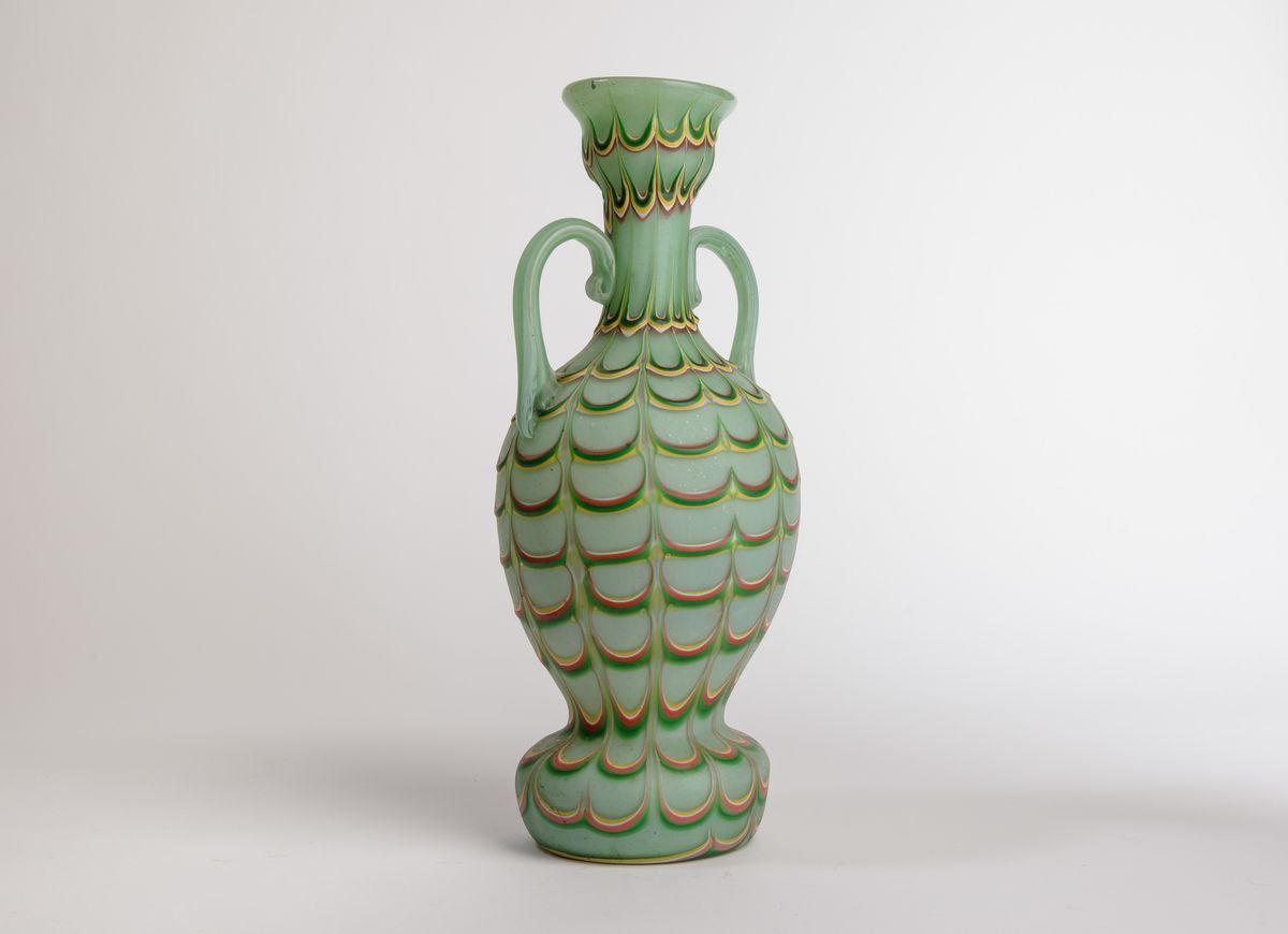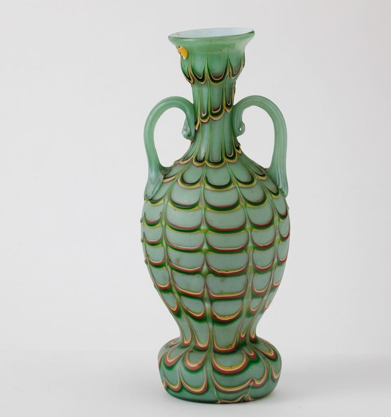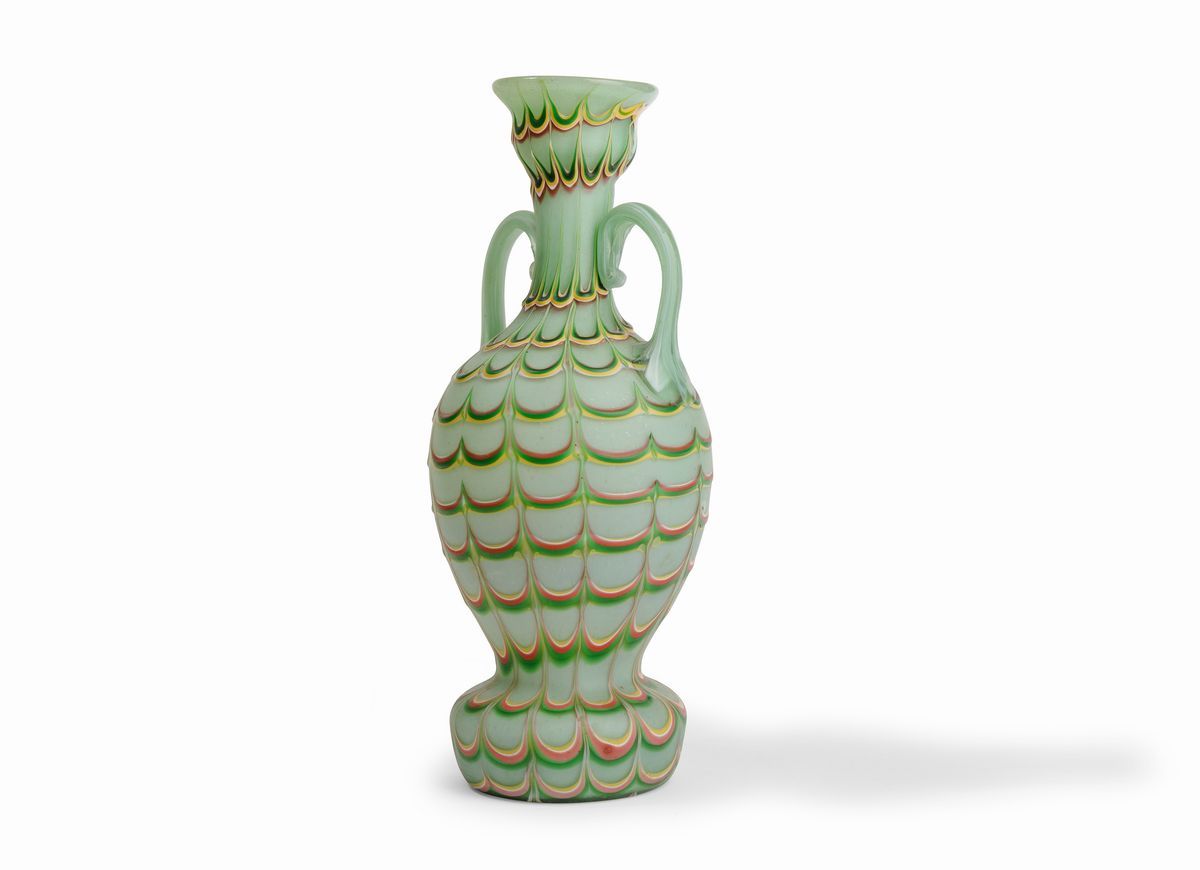 Vaso ad anfora in vetro incamiciato con decoro Fenicio policromo. Anse applicate.